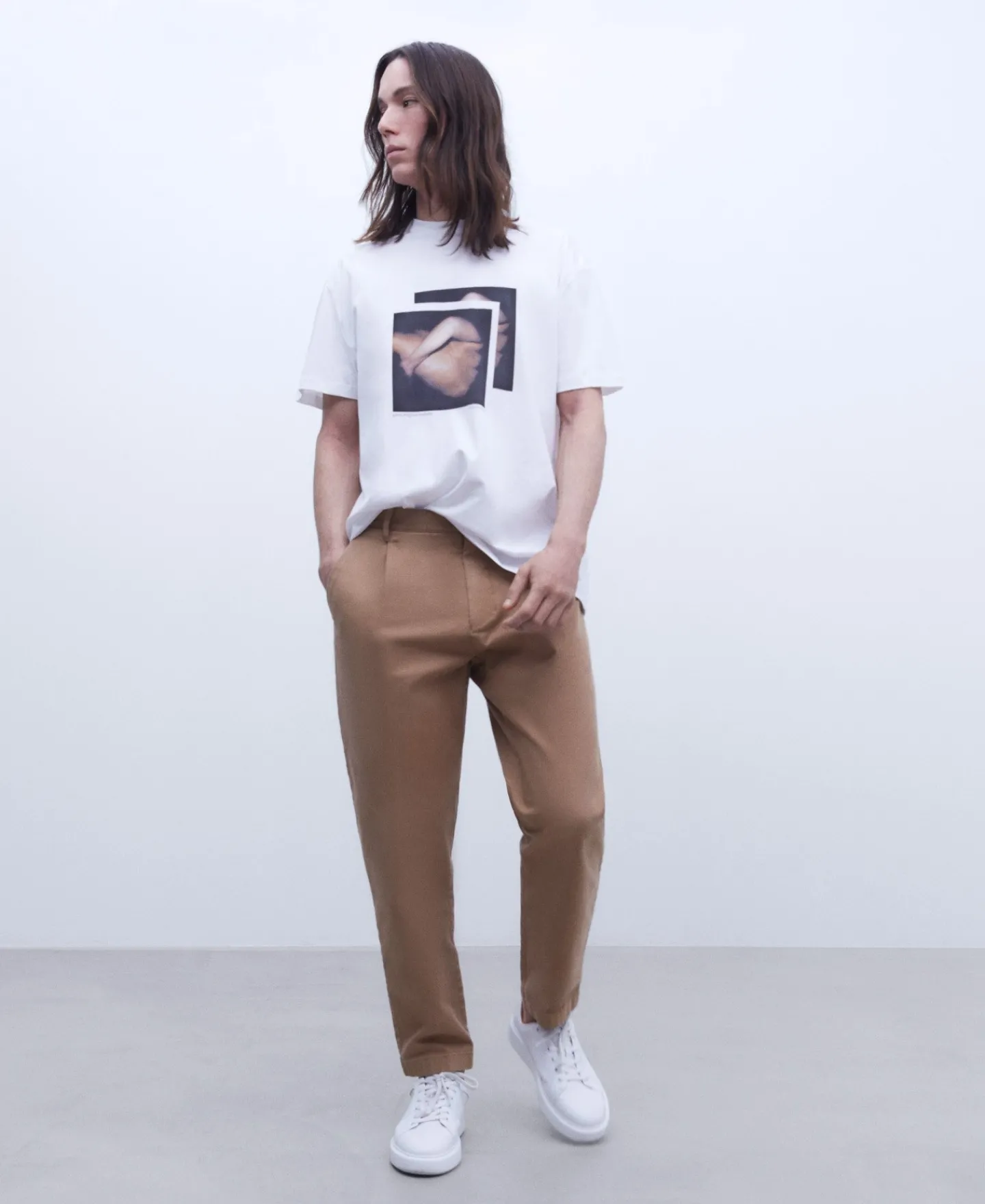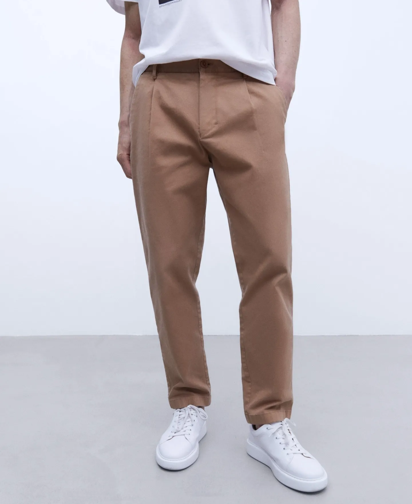Calças Chino Com Pincas Em Algodao. Silhueta Folgada. Bolsos Laterais Embutidos.AlgodaoPincasSilhueta Folgada