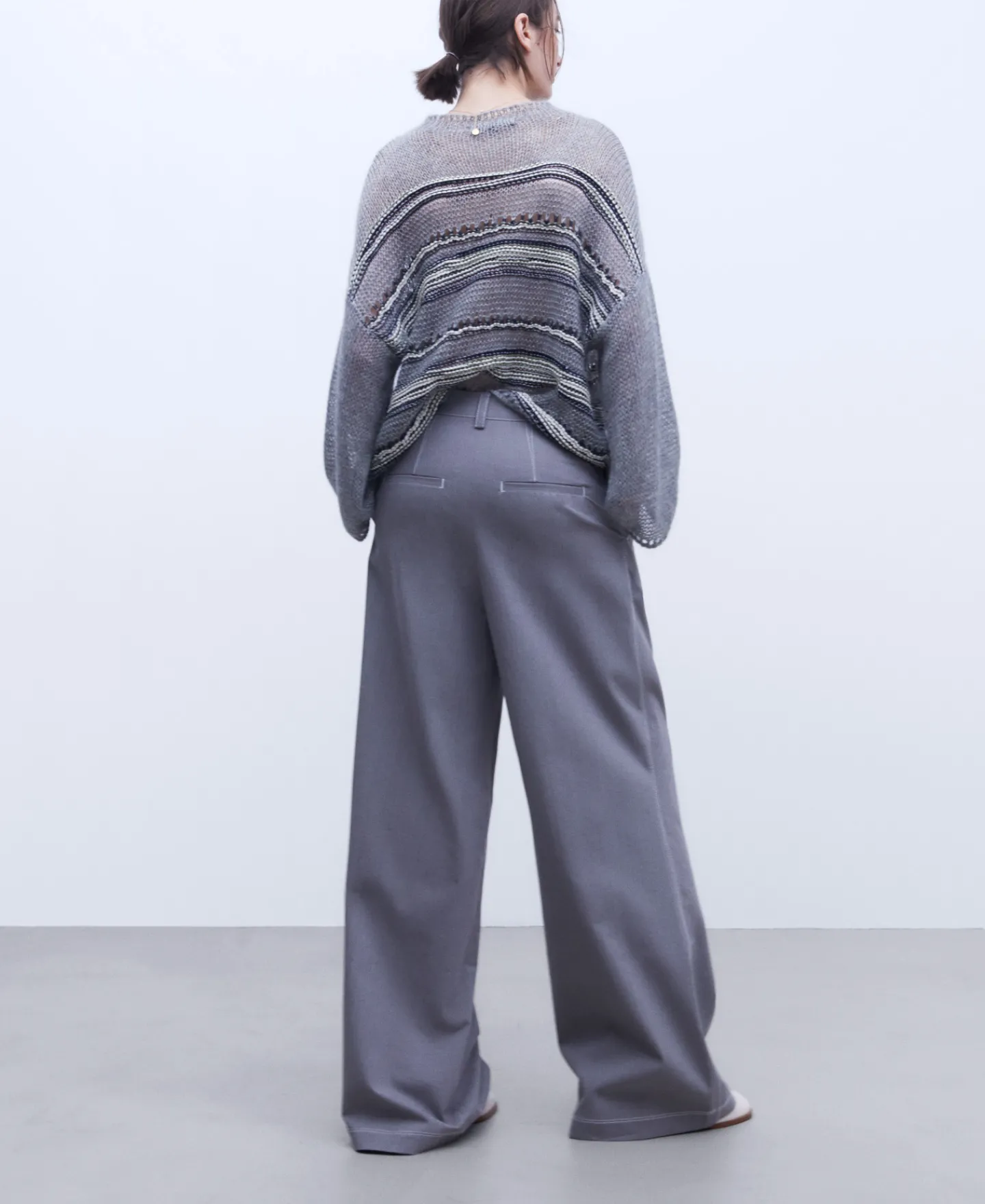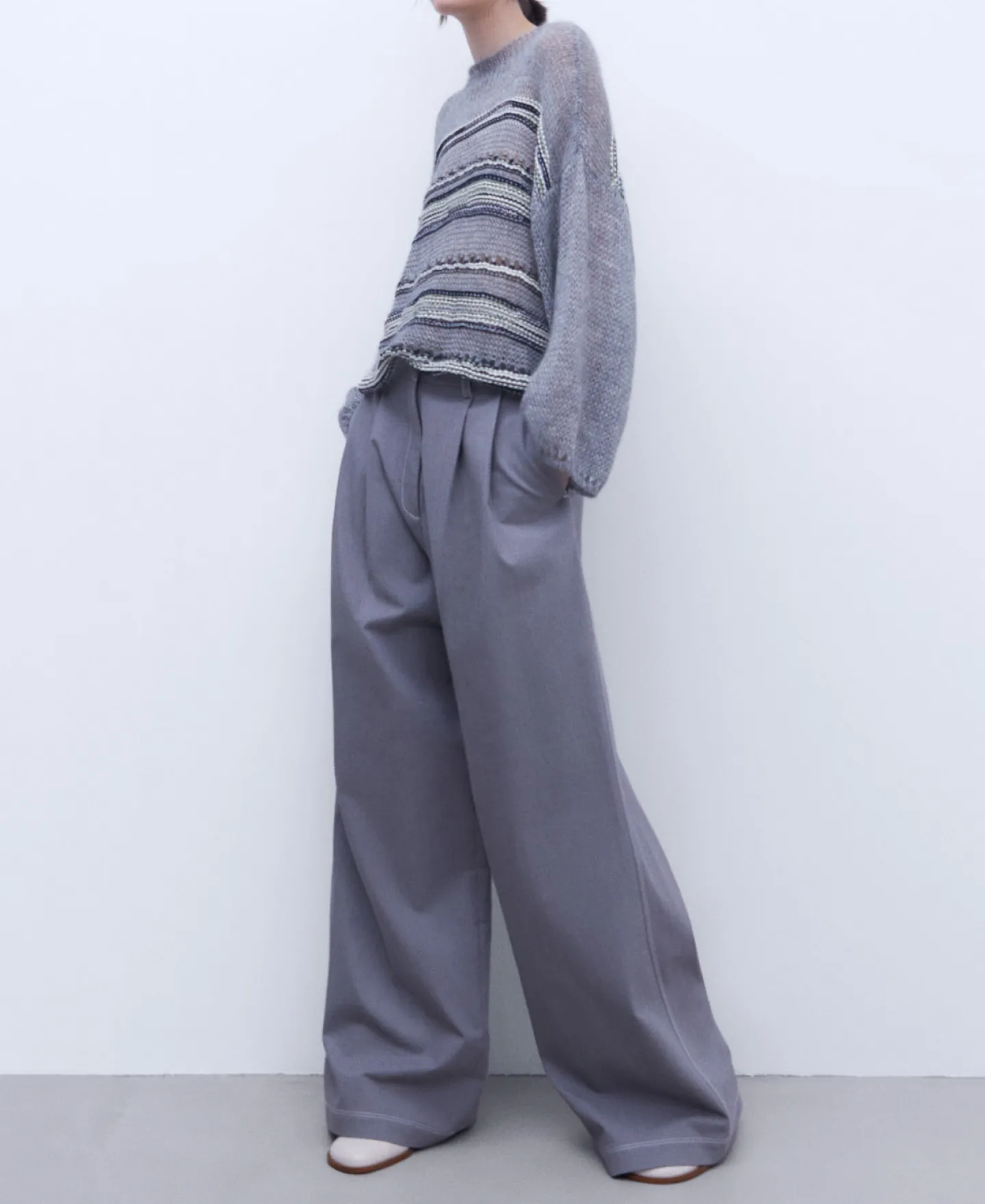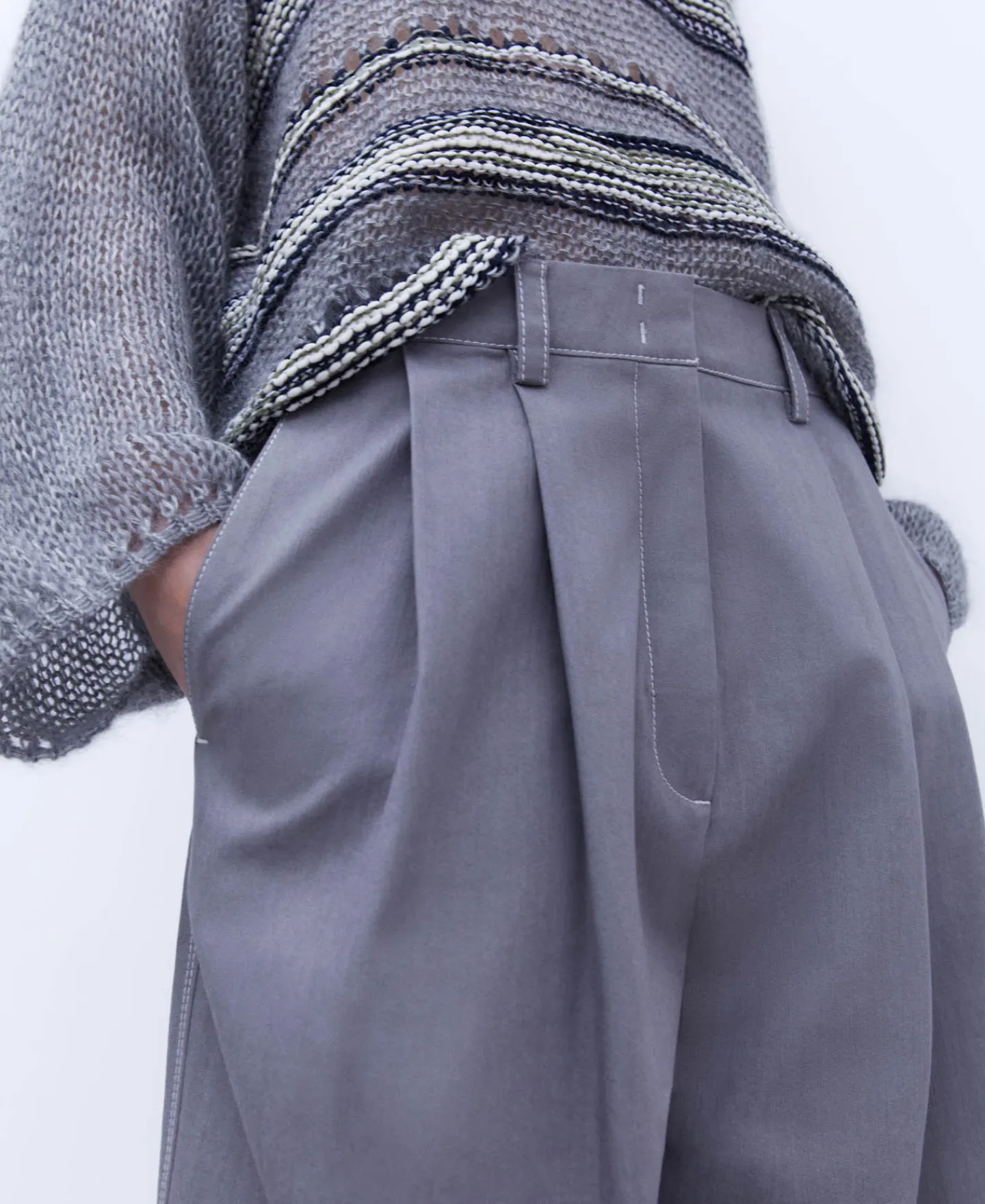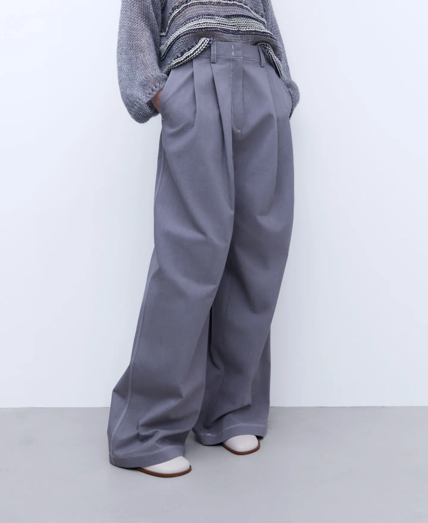 Calças Em Tecido De Algodao. Corte Largo. Pincas. Presilhas. Bolso Lateral. Costuras Em Contraste. Bolsos Posteriores De Alfaiataria. Bainha Reta.