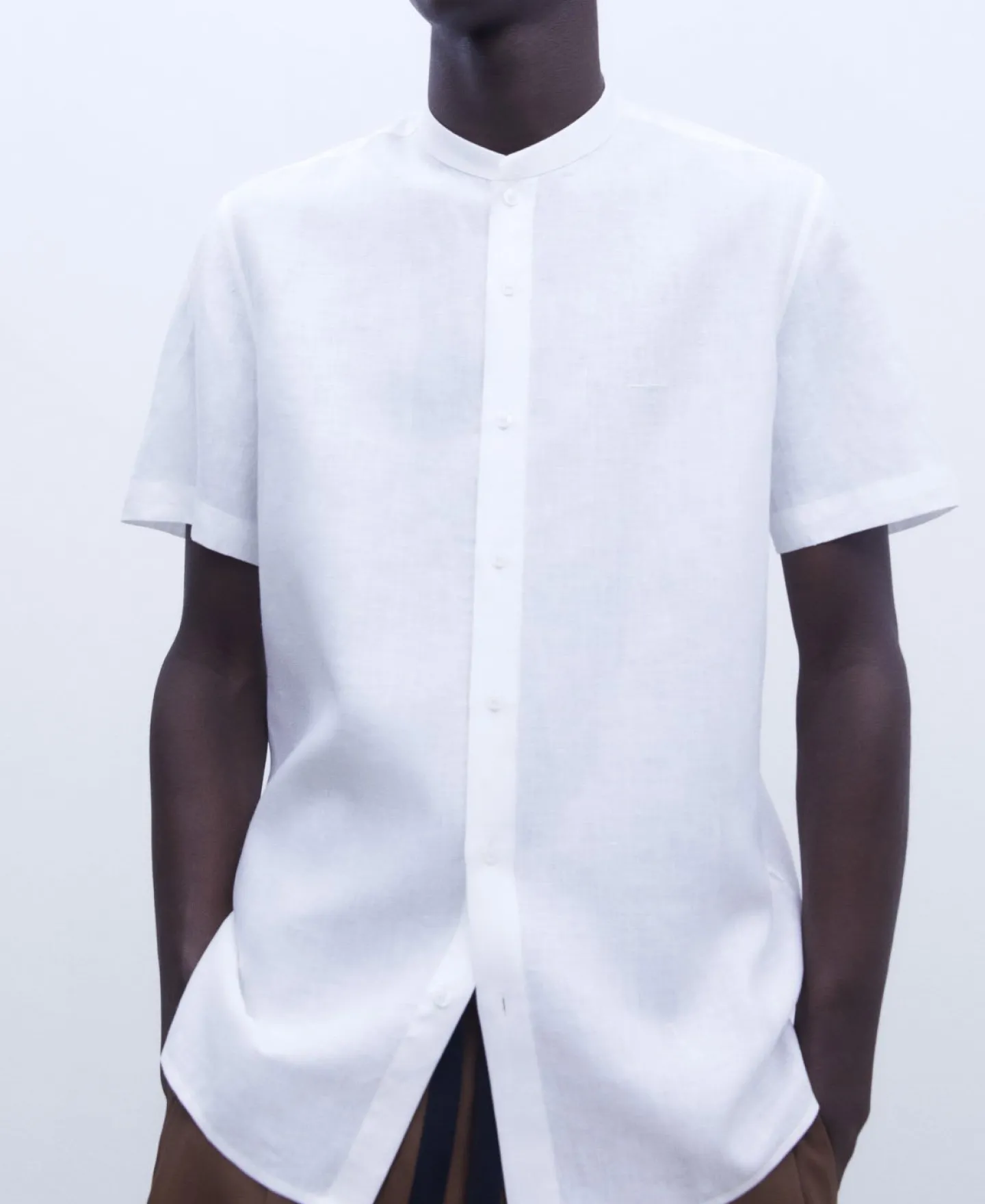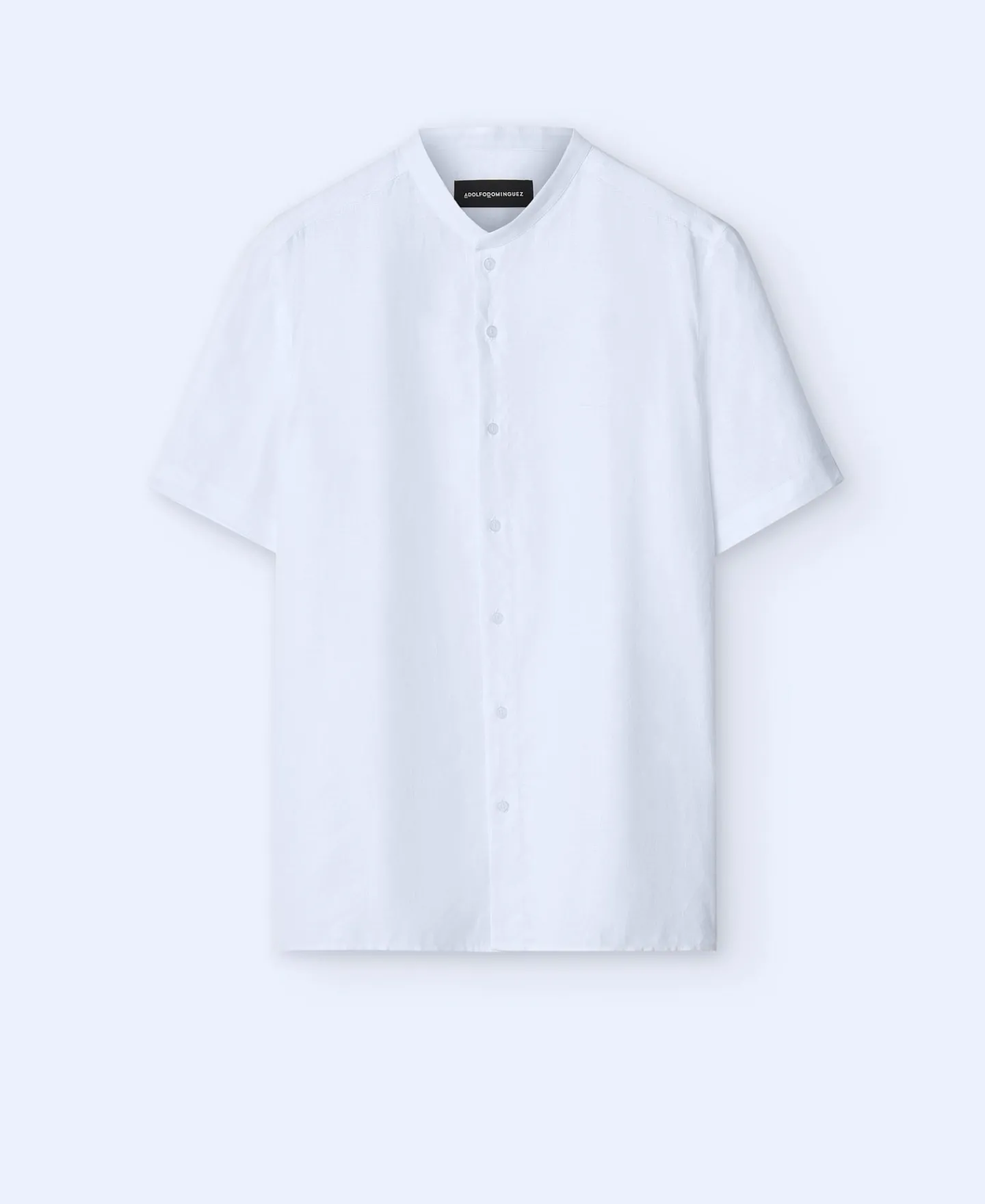 Gola Mao. Abotoadura Central. Logotipo Bordado.100% Linho EuropeuGola MaoManga CurtaLogotipo BordadoBainha Reta