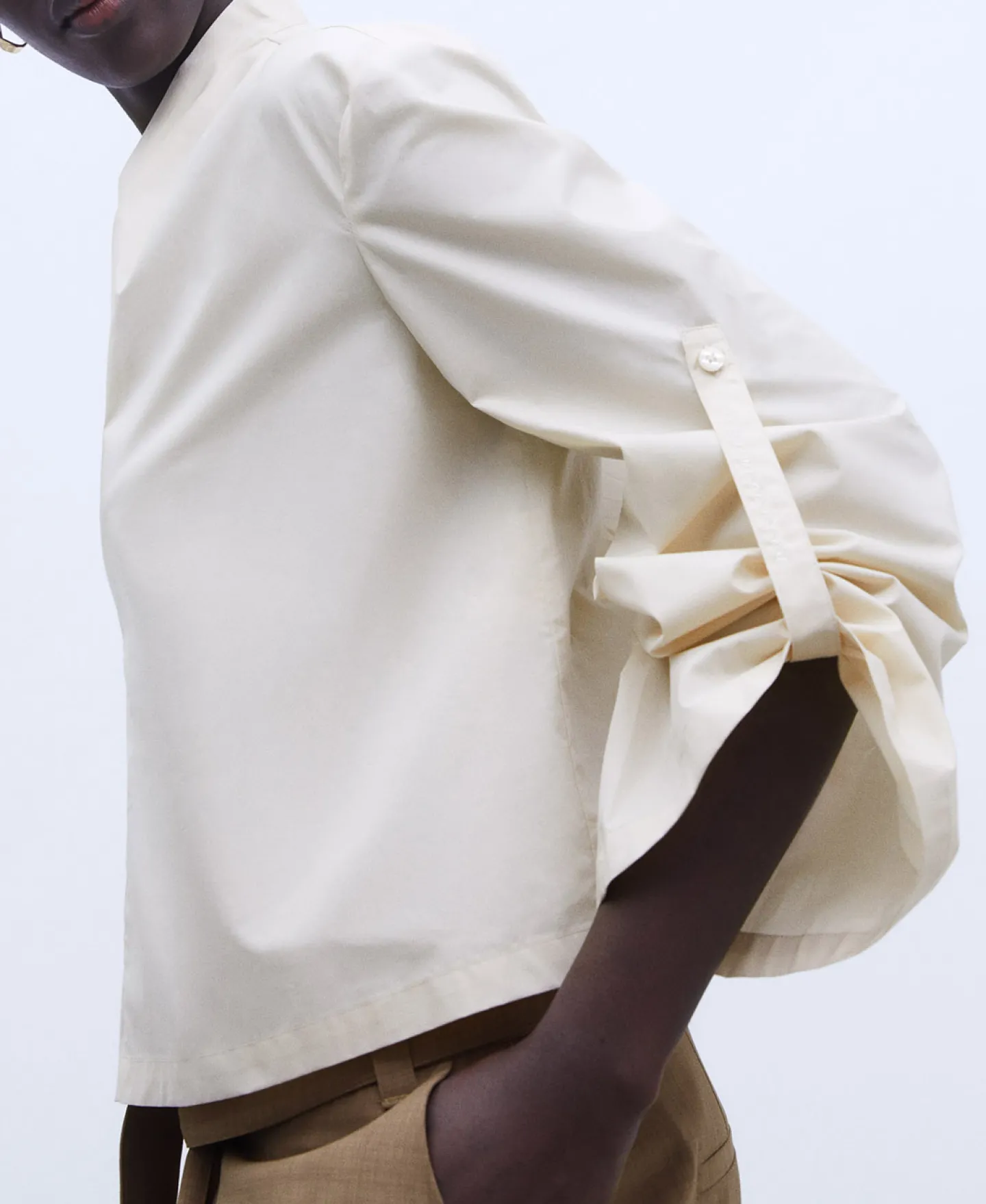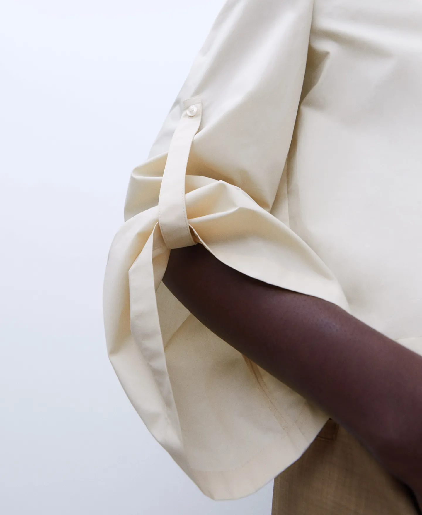Camisa Ampla. 100% Algodao Organico. Decote Em V. Pincas No Ombro. Manga Comprida E Caida. Punho Evase. Escapulario Nas Costas. Prega Posterior. Bainha Reta.