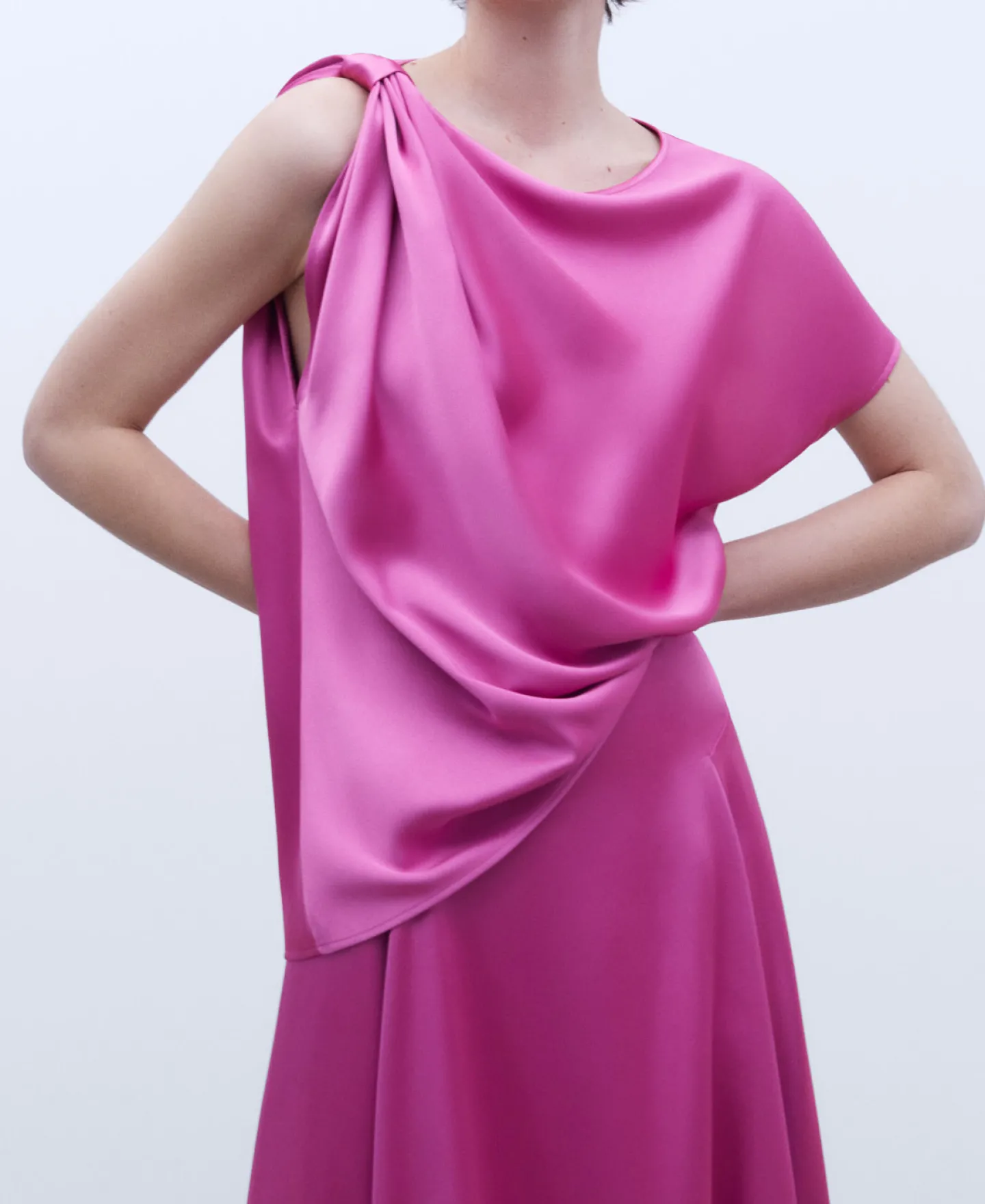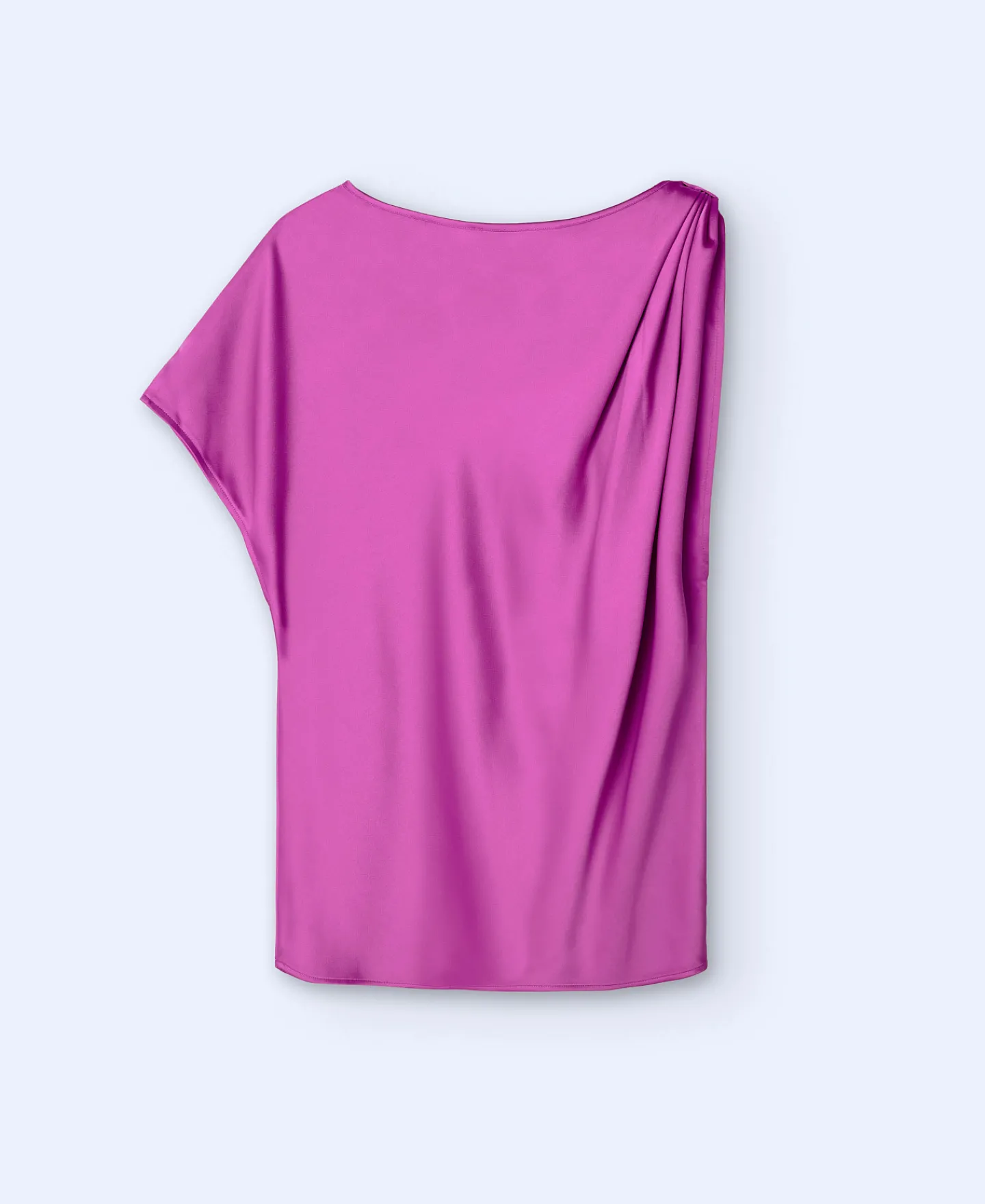 Camisa Assimetrica. Gola Redonda. Sisa Esquerda Caida. Sisa Direita Drapeada. Bainha Reta. Acetinada.