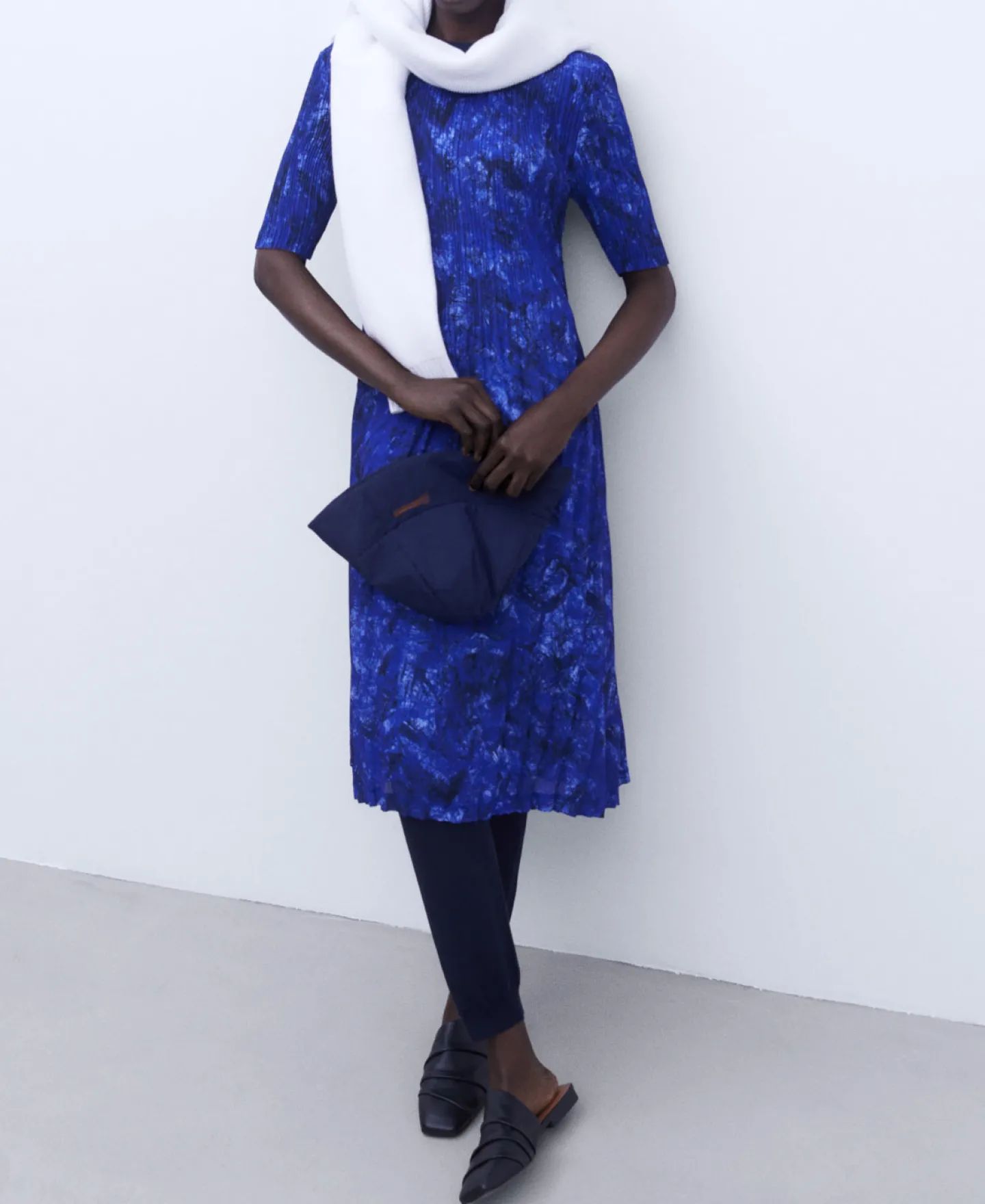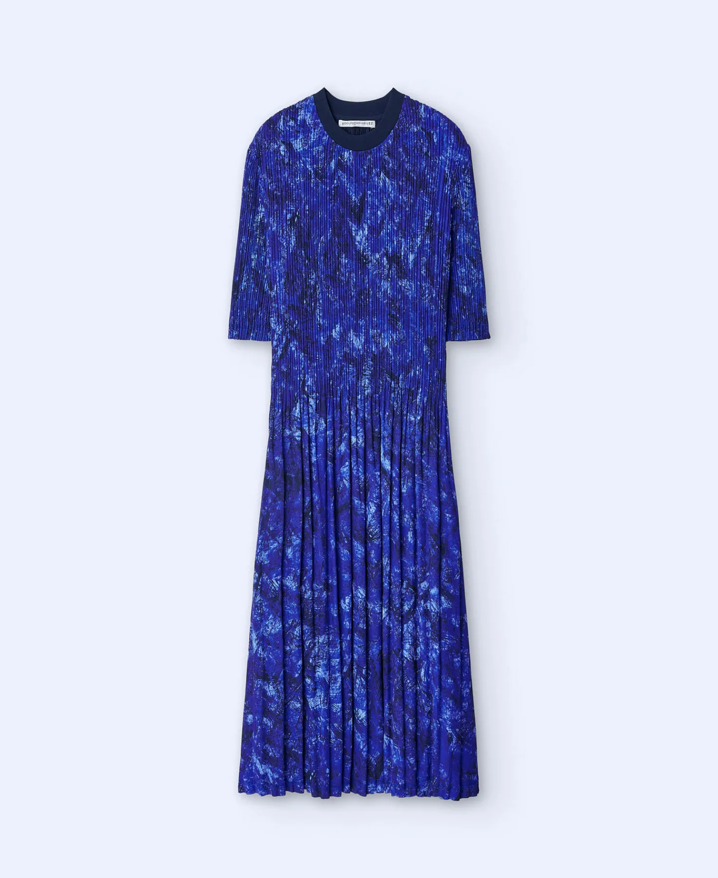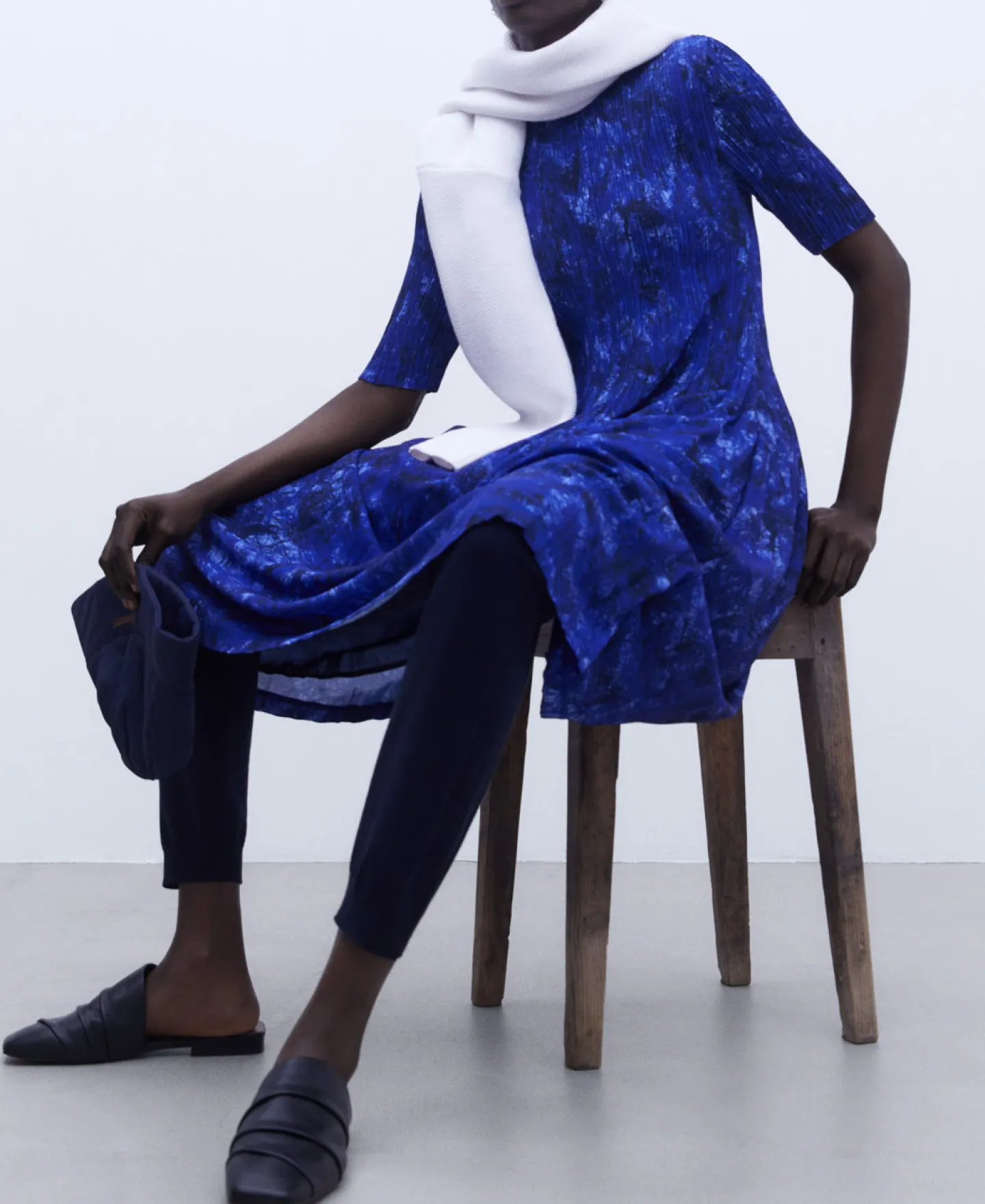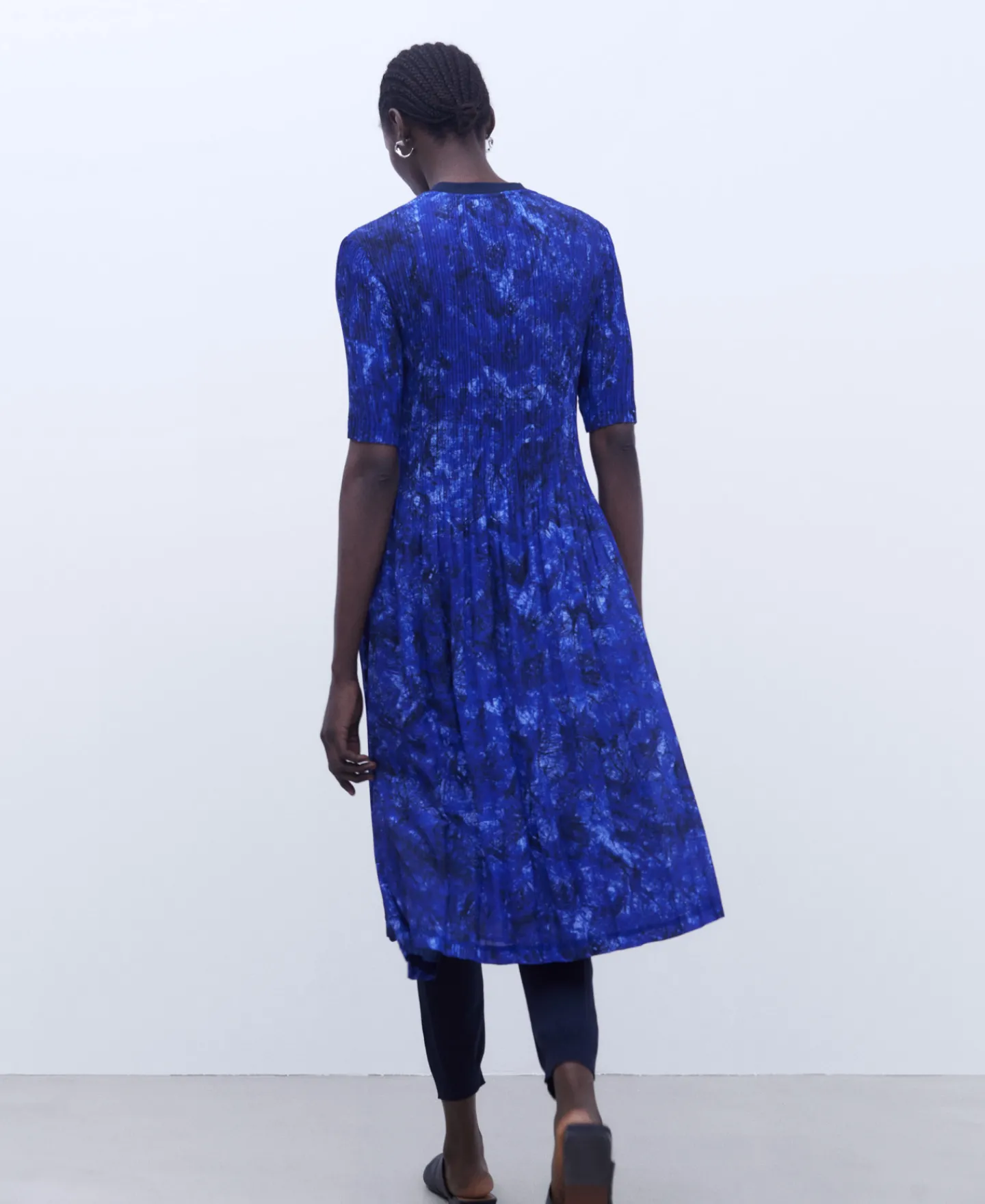 Vestido De Crinkle Estampado. Gola Redonda Em Malha. Manga Curta. Comprimento Pelo Joelho. Costura Overlock Nas Mangas E…