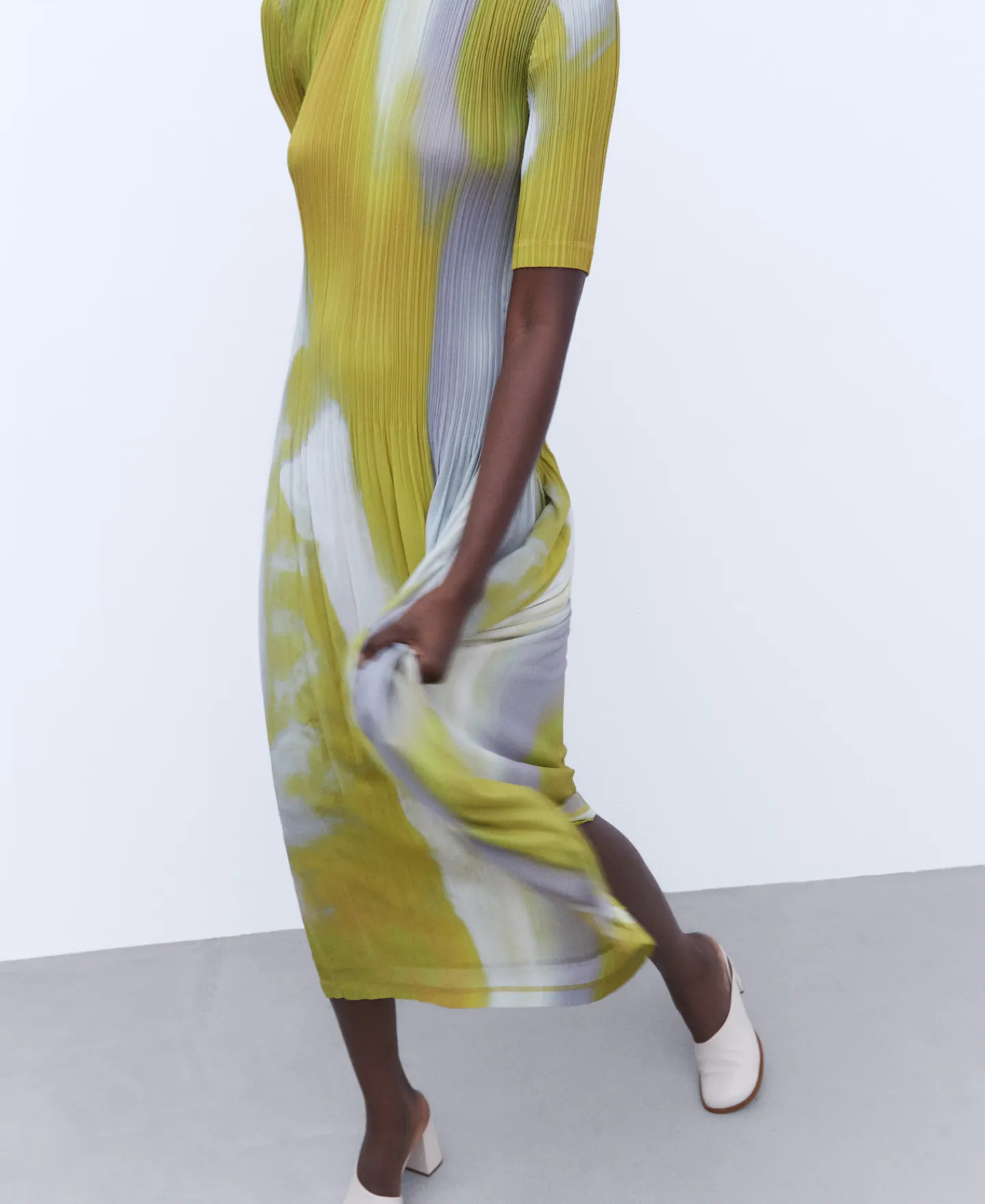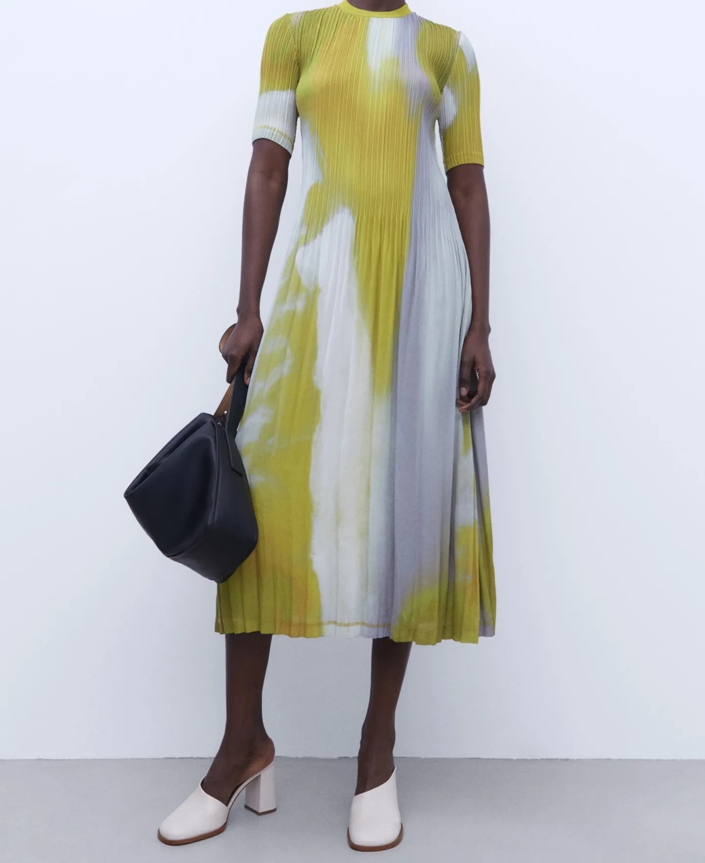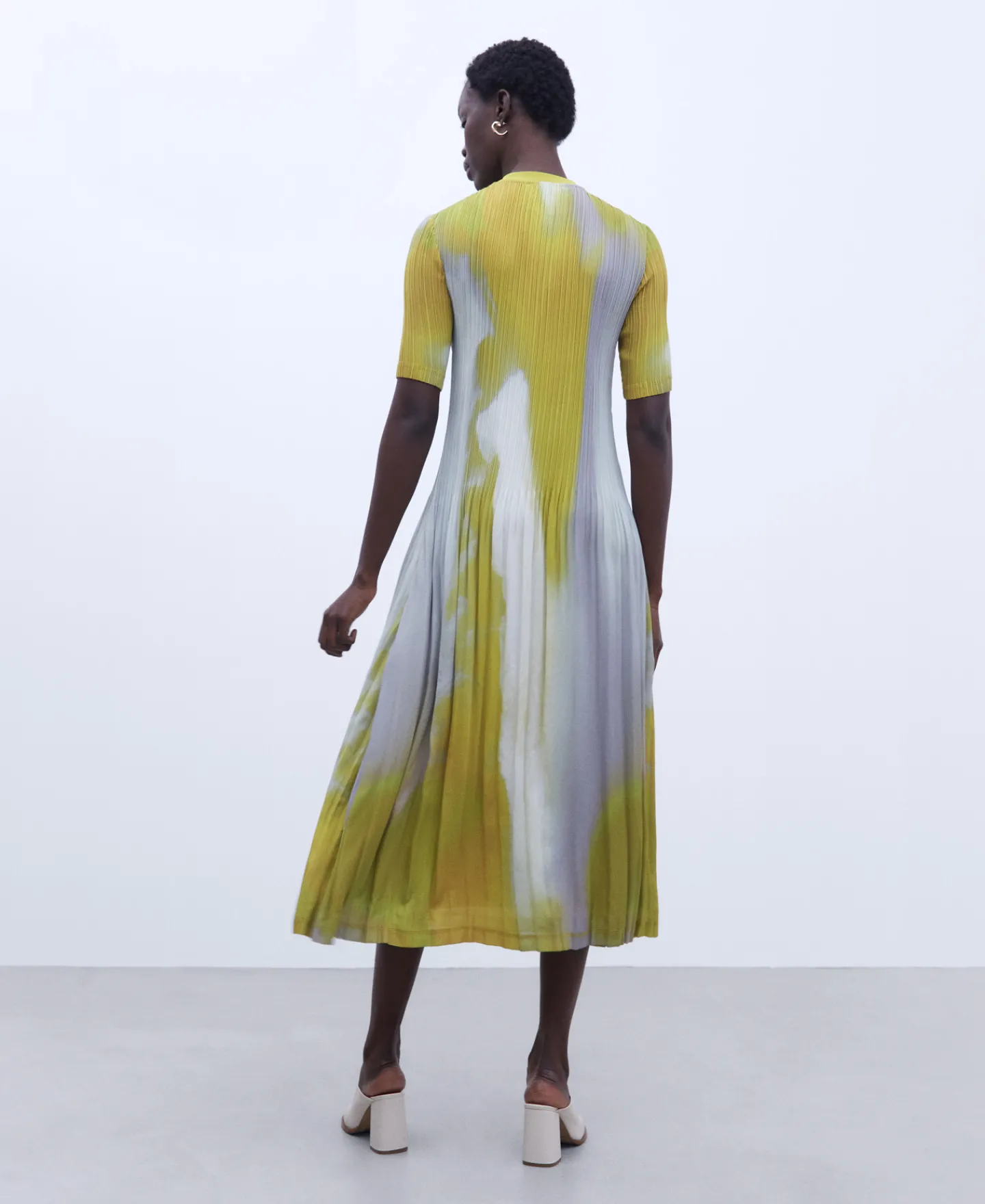 Vestido Comprido Em Crinkle. Gola Redonda. Estampado. Manga Curta. Plissado Duplo.