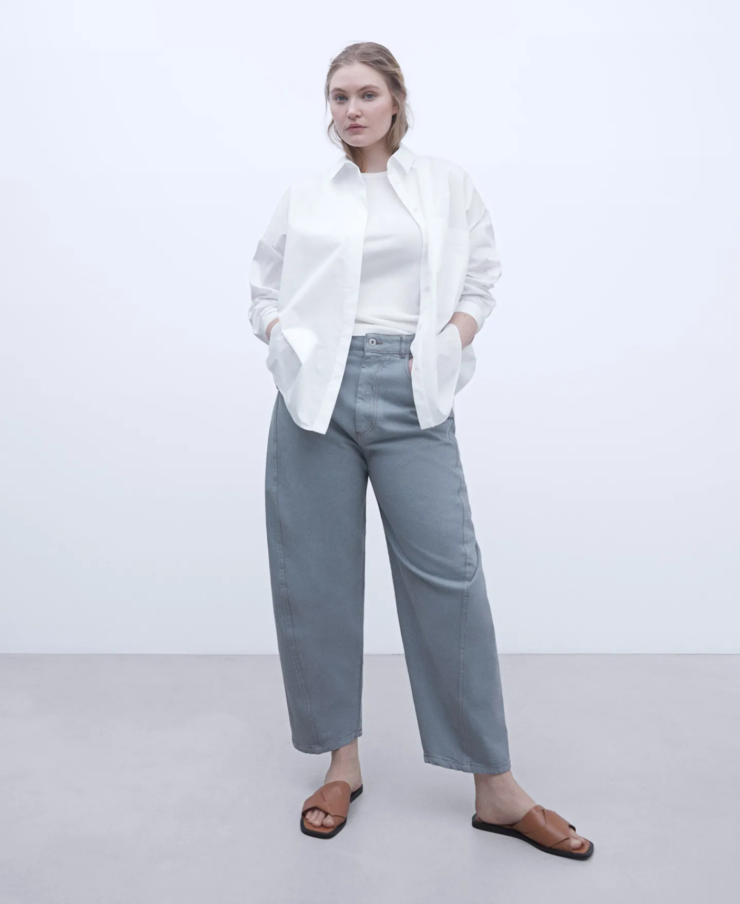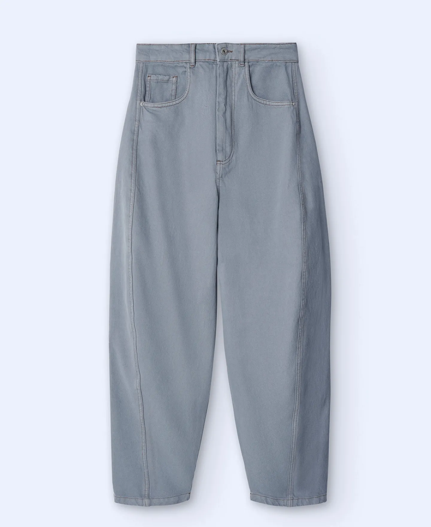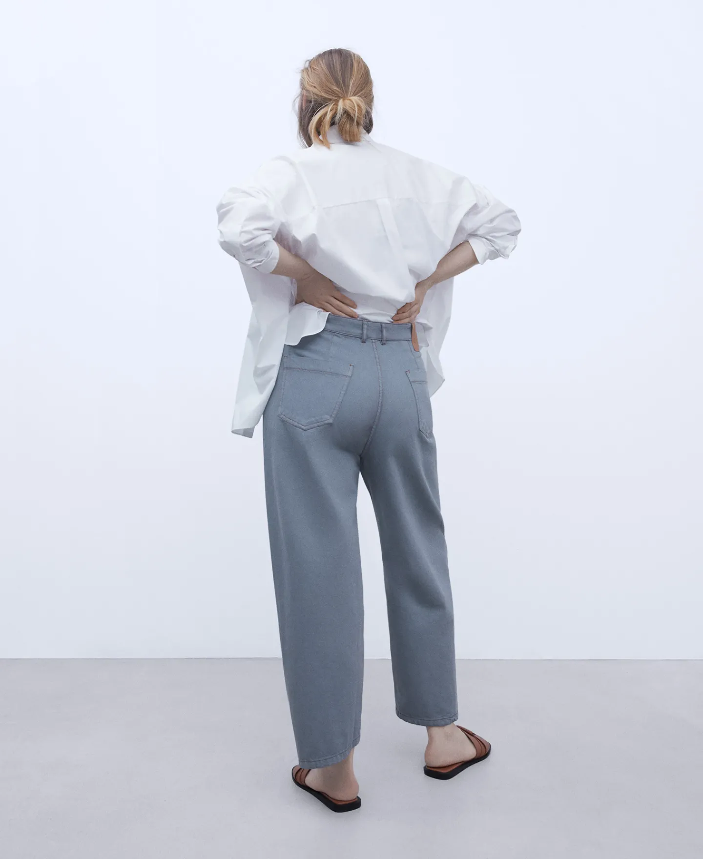 Calças De Ganga Banana Em Algodao. Presilhas. Fecho Com Botao E Fecho De Correr. Cinco Bolsos. Costuras Em Contraste. Cintura Alta. Bainha Reta.
