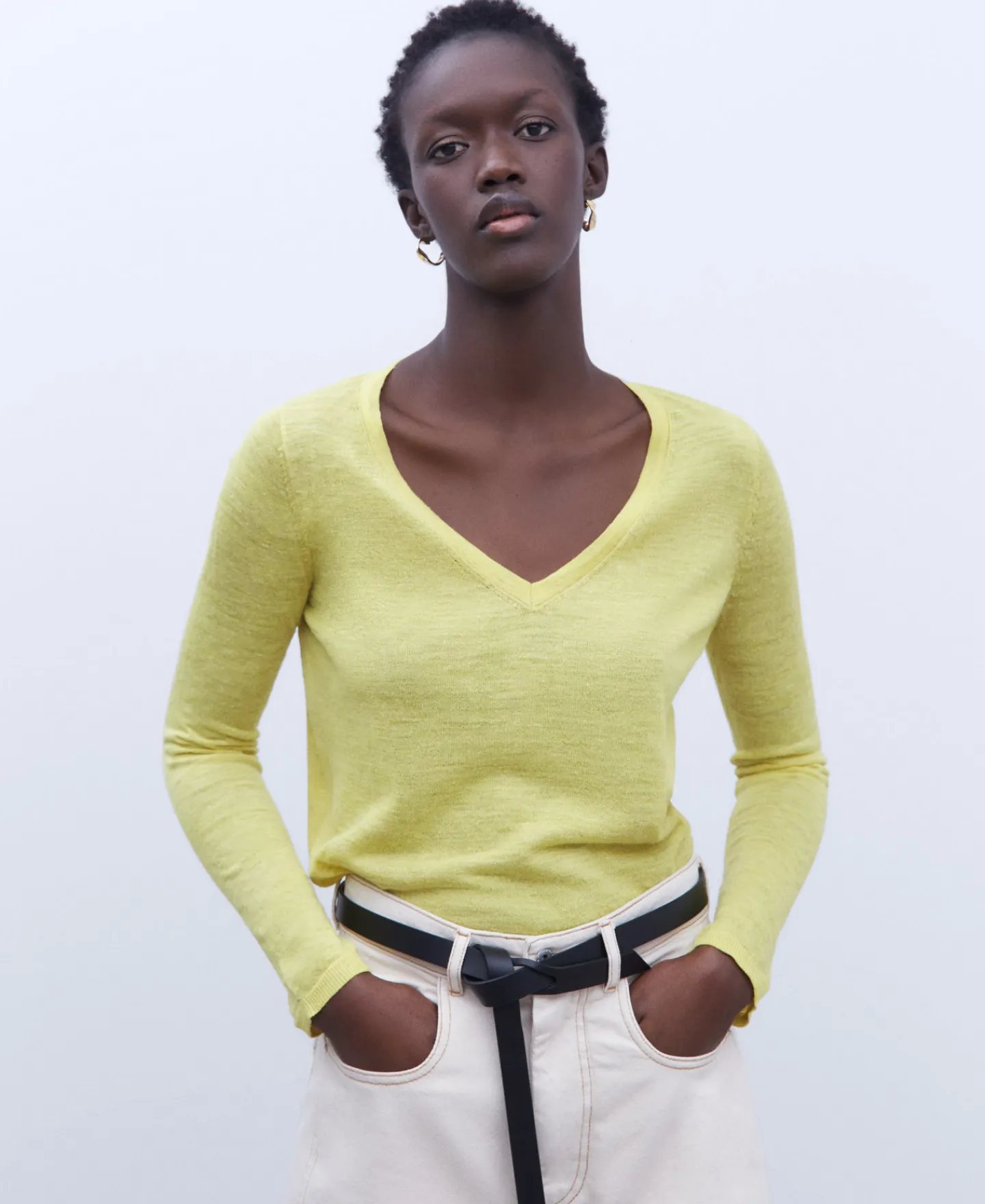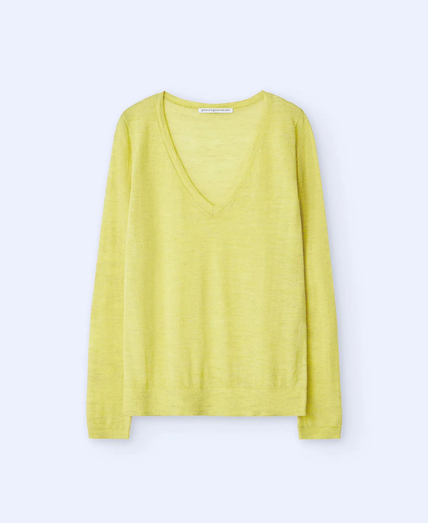 Camisola Em Tecido De Linho E Alpaca. Decote Em V. Manga Comprida. Acabamentos Canelados.
