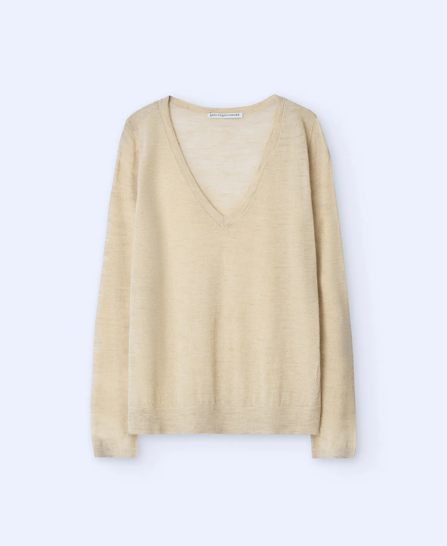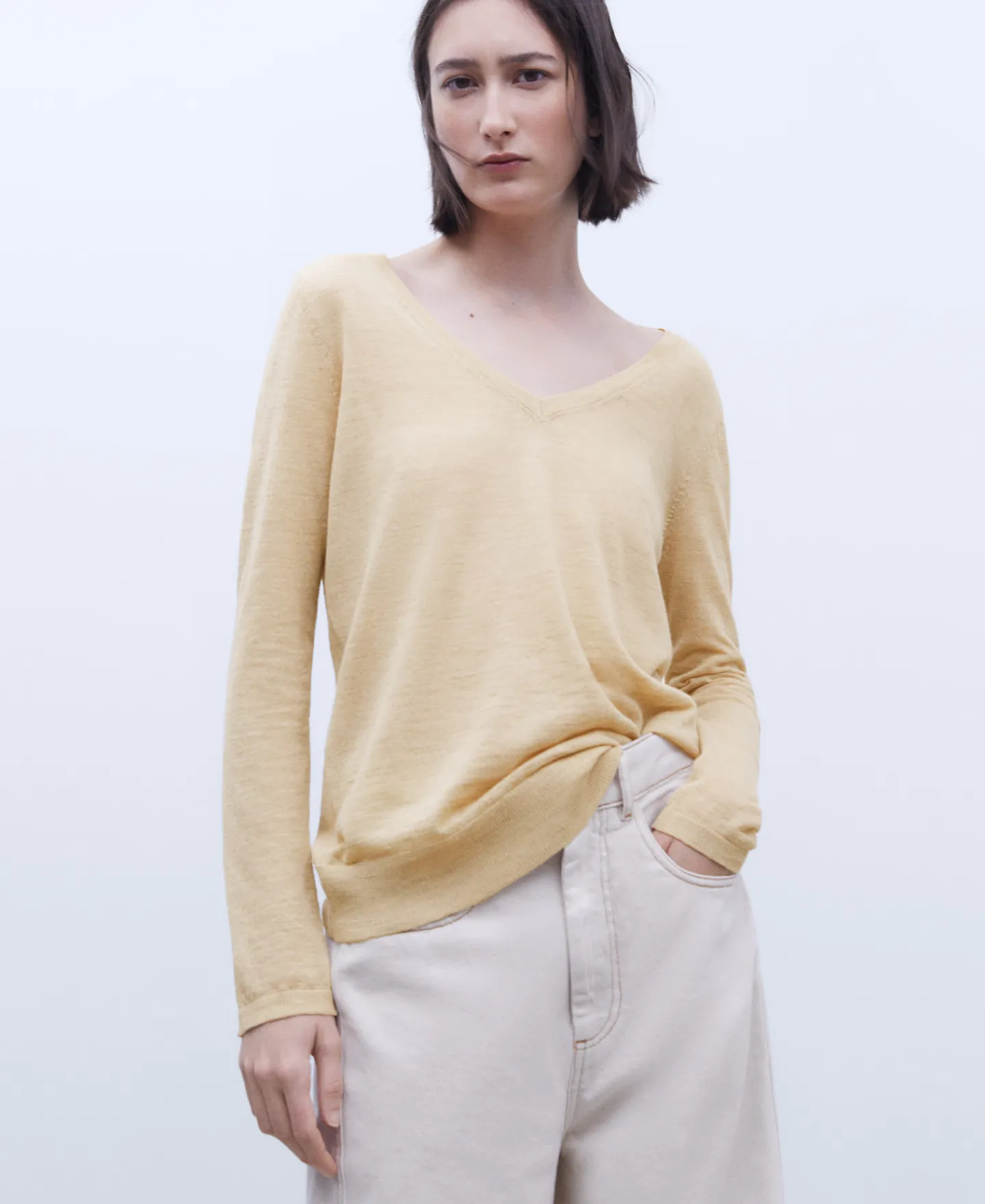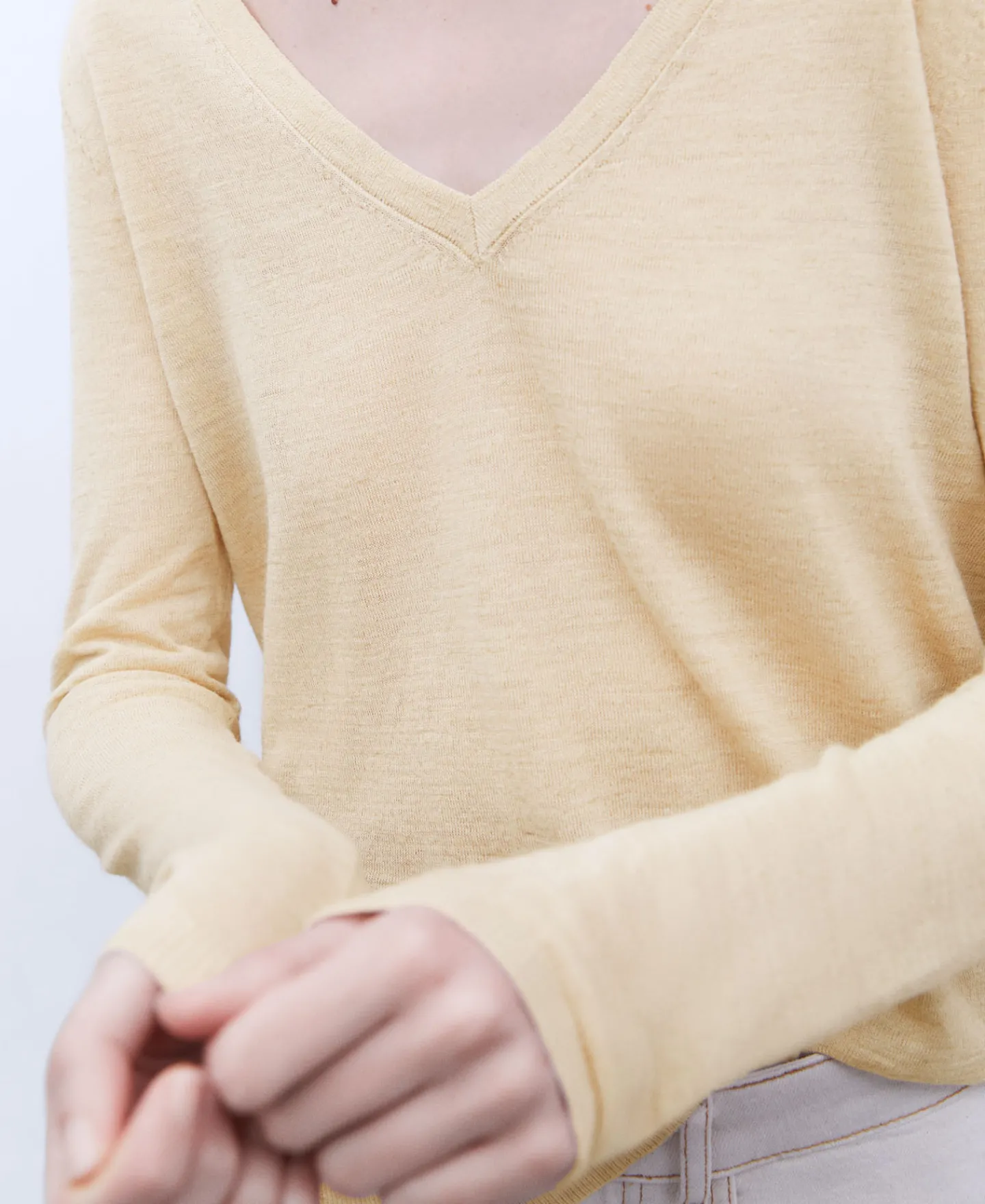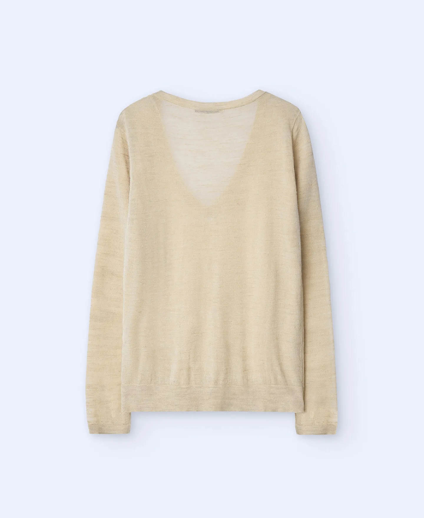 Camisola Em Tecido De Linho E Alpaca. Decote Em V. Manga Comprida. Acabamentos Canelados.