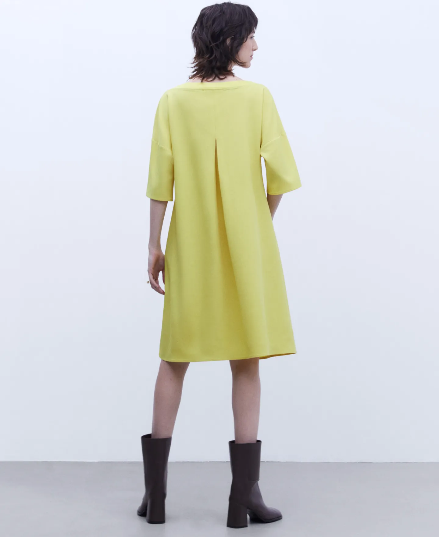 Vestido Curto Evase. Decote Barco. Manga Pelo Cotovelo. Bolso Lateral. Pinca Posterior. Acabamentos Canelados. Bainha Re…