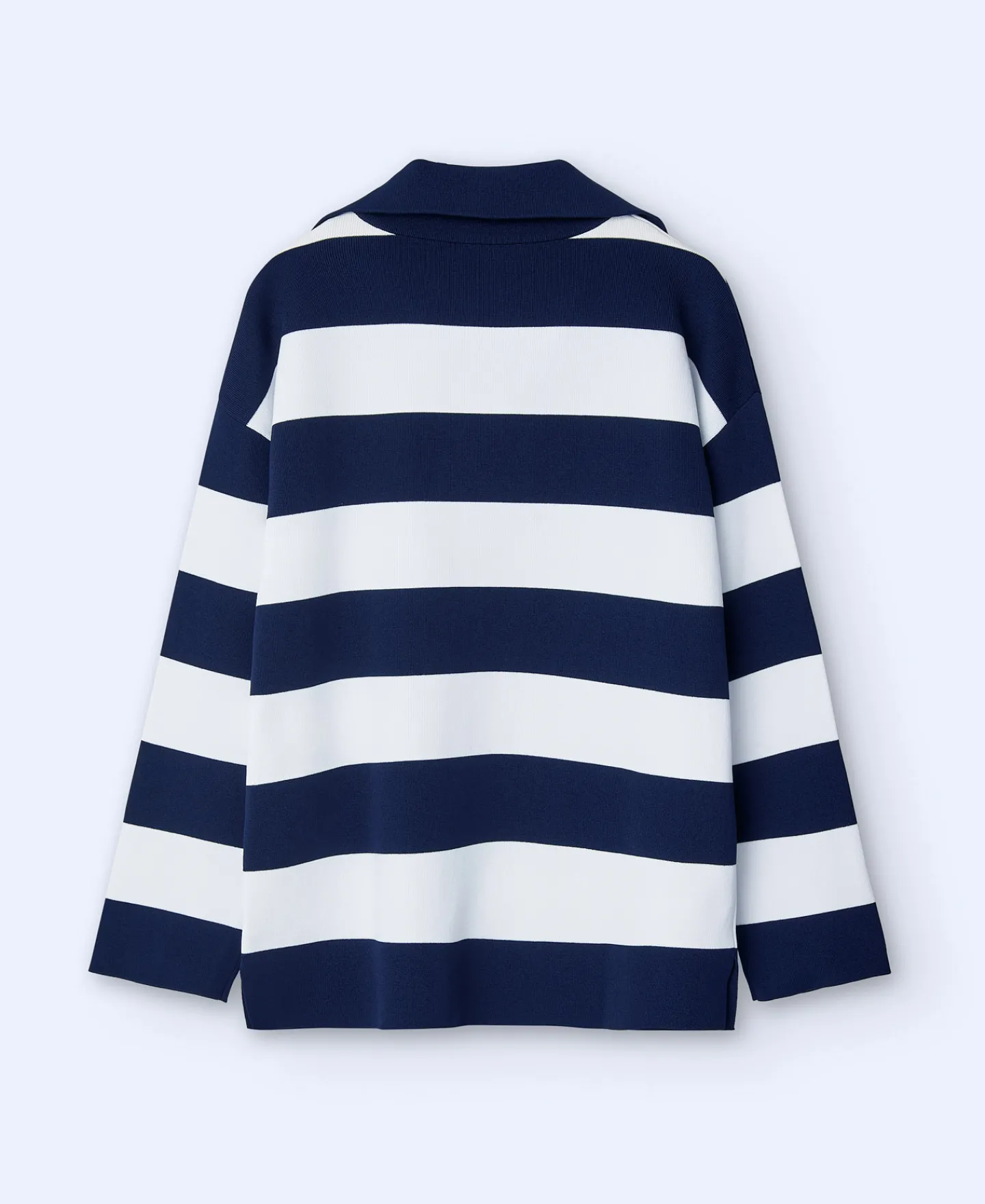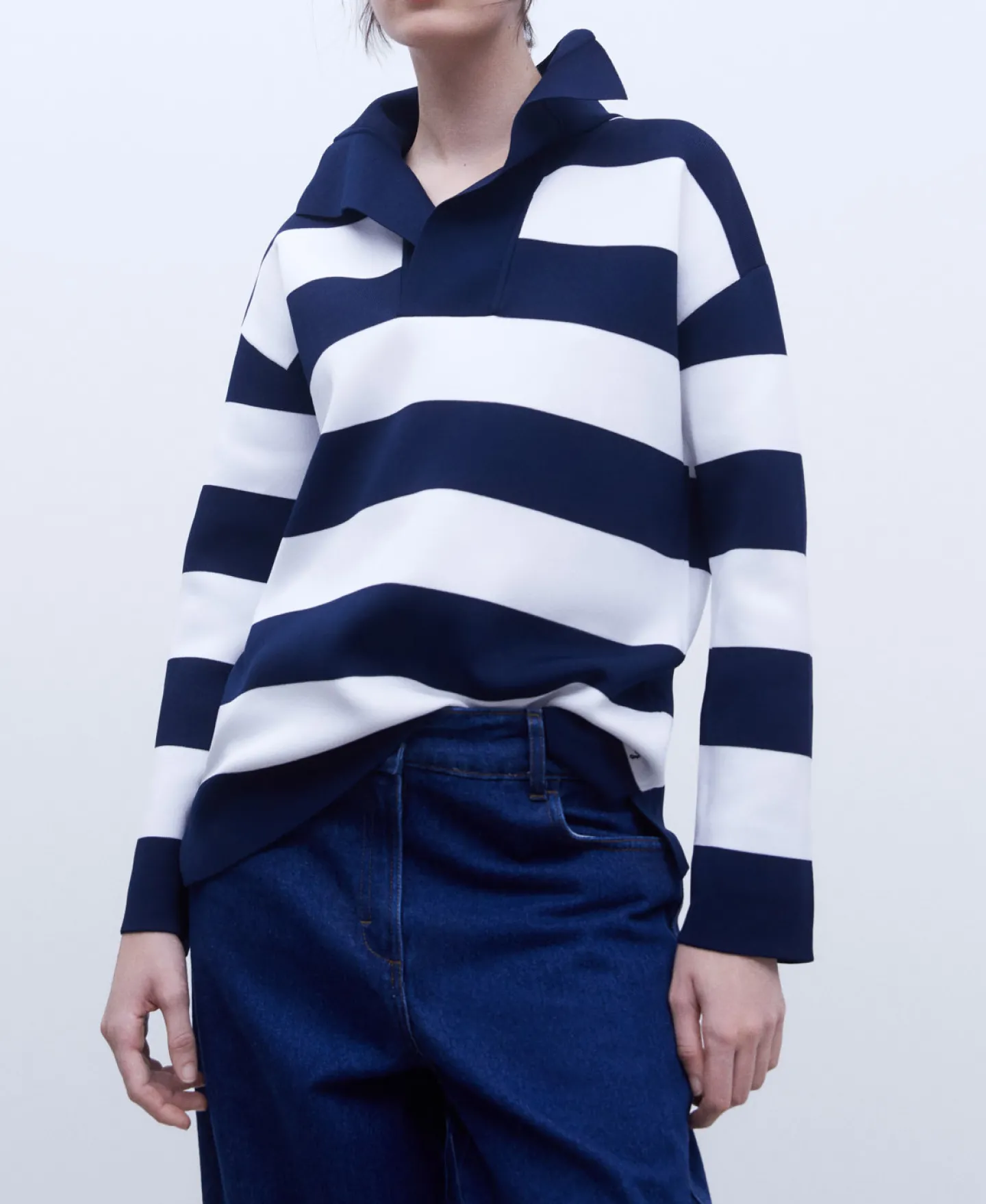 Camisola As Riscas. Viscose E Nylon Reciclado. Gola Marinheiro. Decote Pronunciado. Manga Comprida E Caida. Bainha Reta.