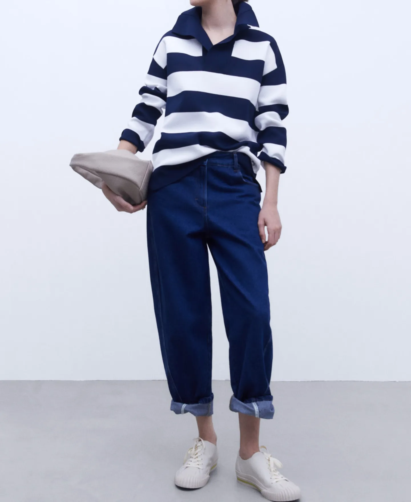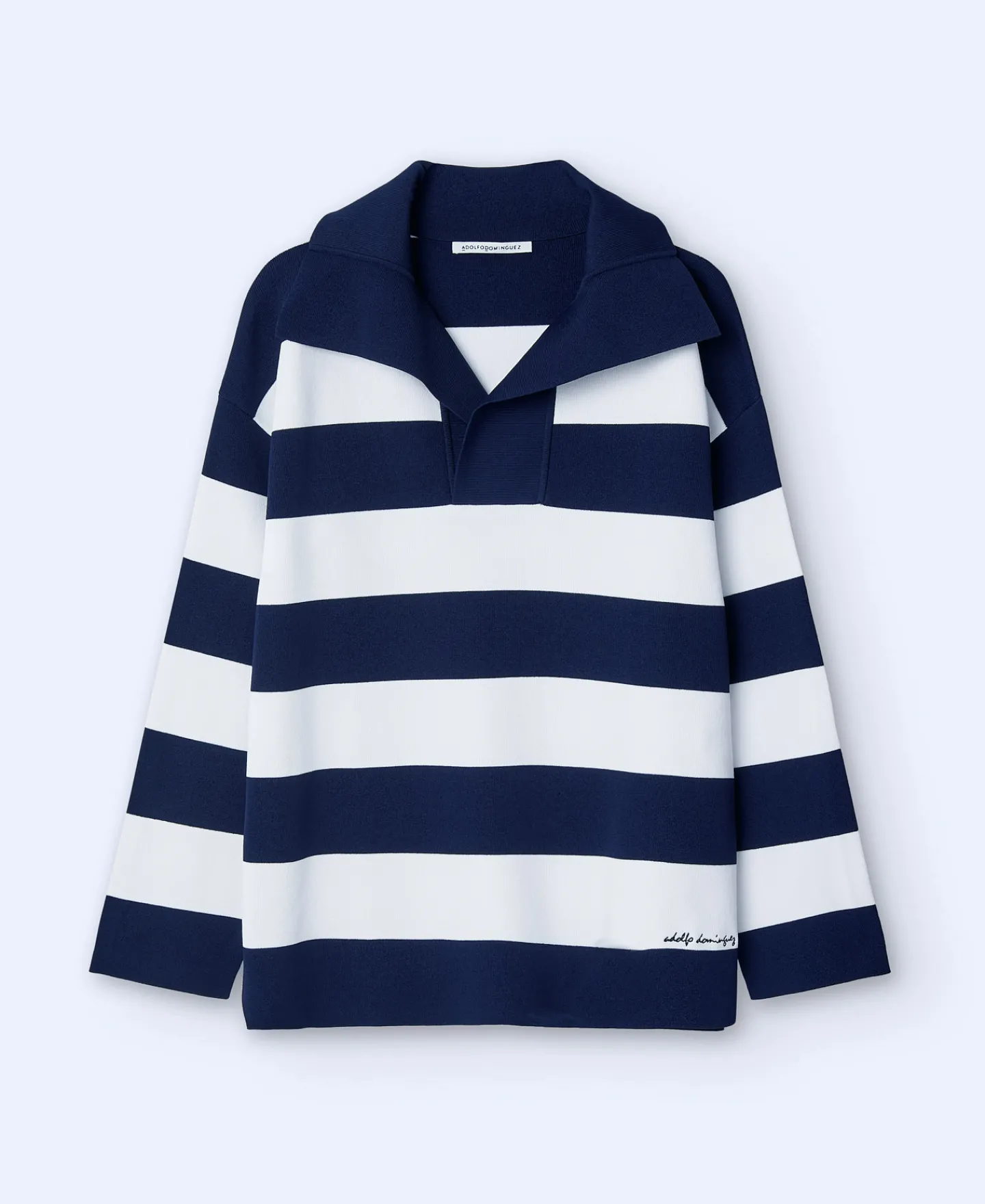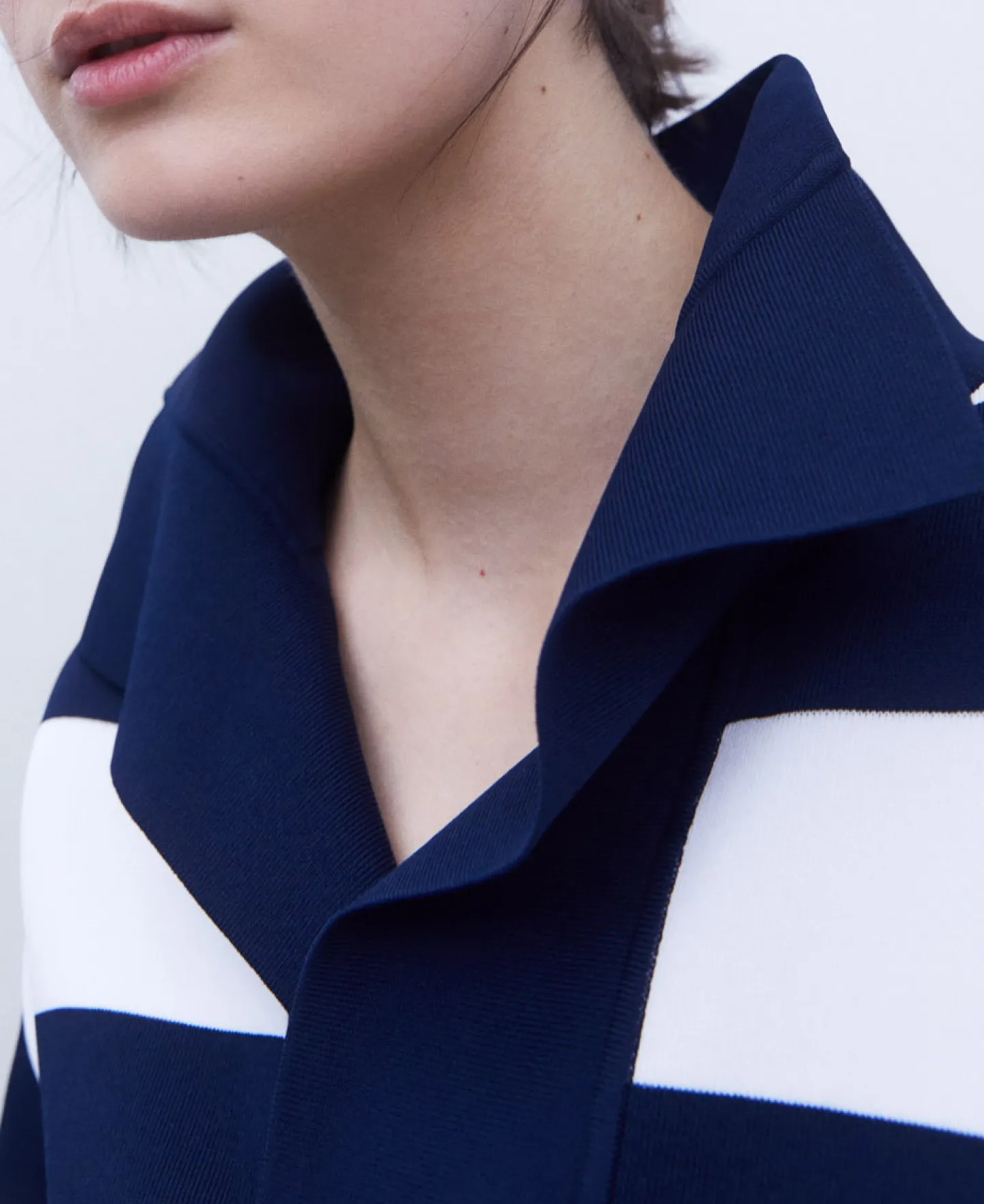 Camisola As Riscas. Viscose E Nylon Reciclado. Gola Marinheiro. Decote Pronunciado. Manga Comprida E Caida. Bainha Reta….