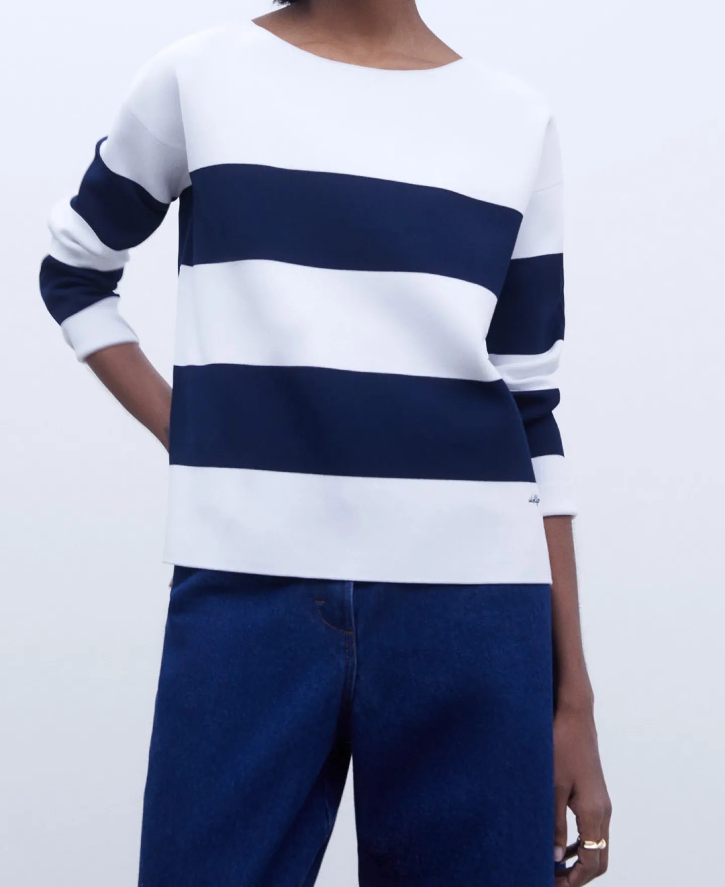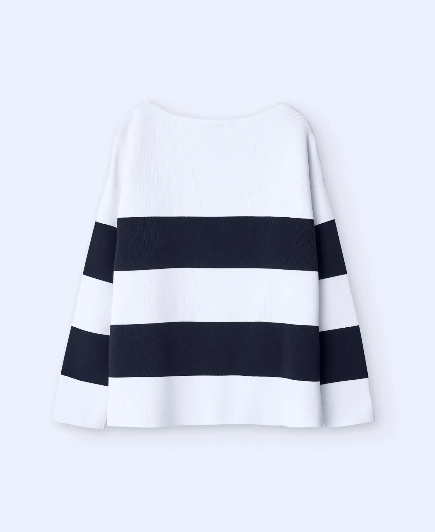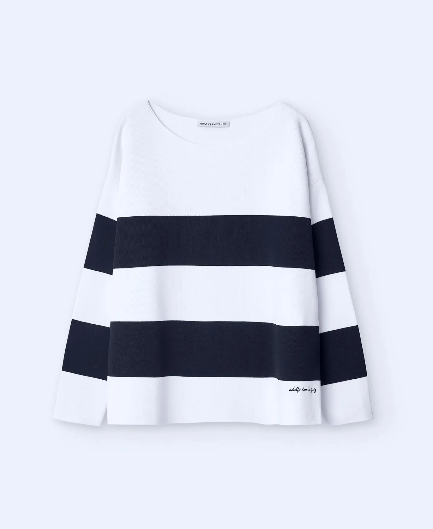 Camisola As Riscas Em Malha. Decote Redondo. Manga Comprida E Caida. Bainha Reta. Logotipo Bordado.