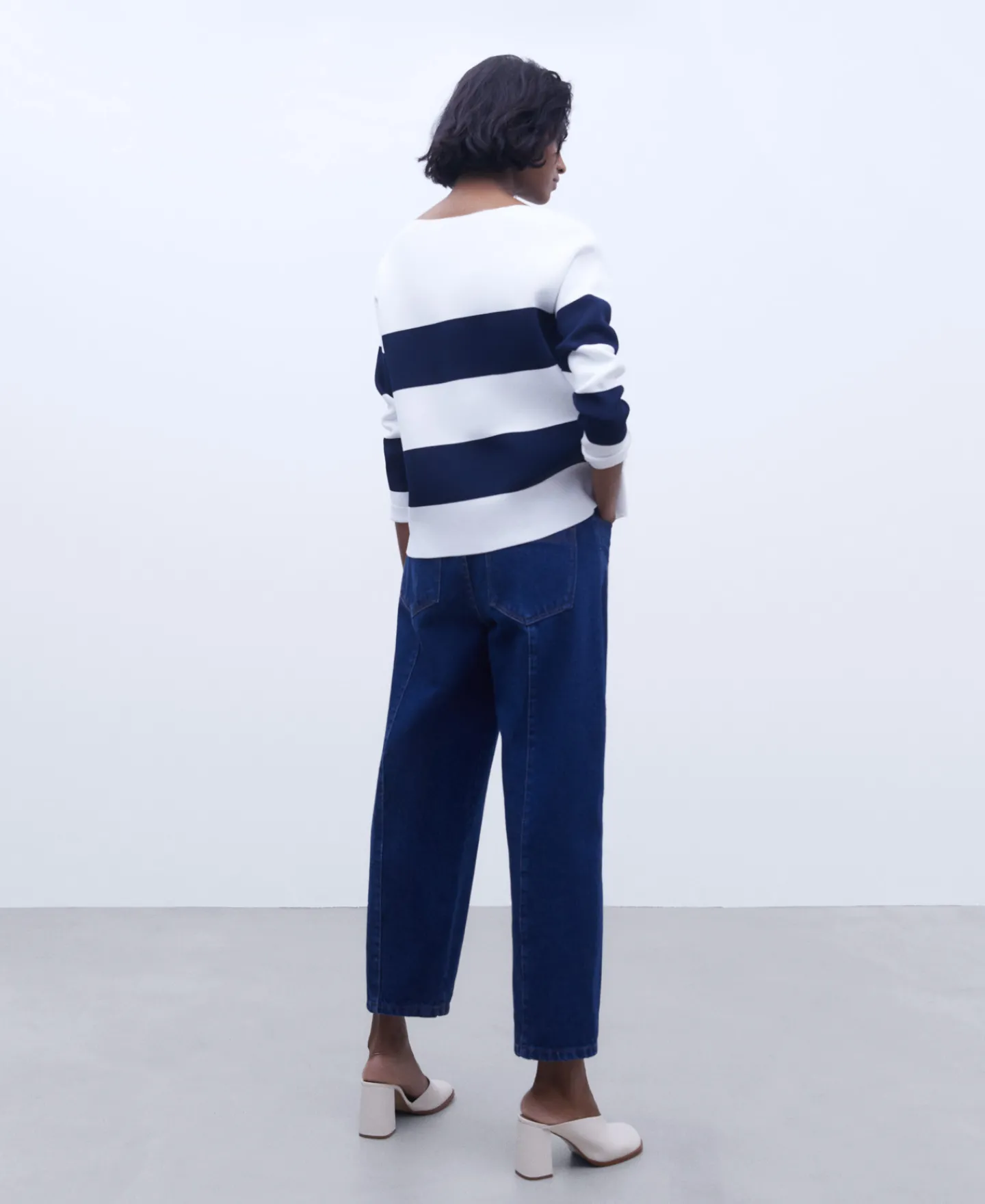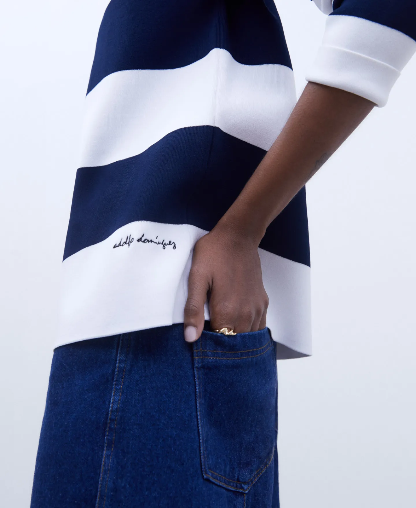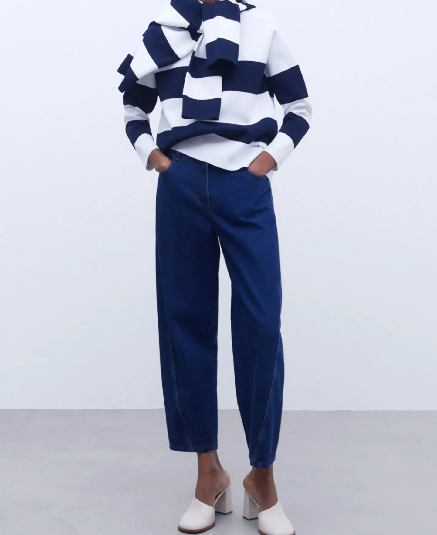 Camisola As Riscas Em Malha. Decote Redondo. Manga Comprida E Caida. Bainha Reta. Logotipo Bordado.
