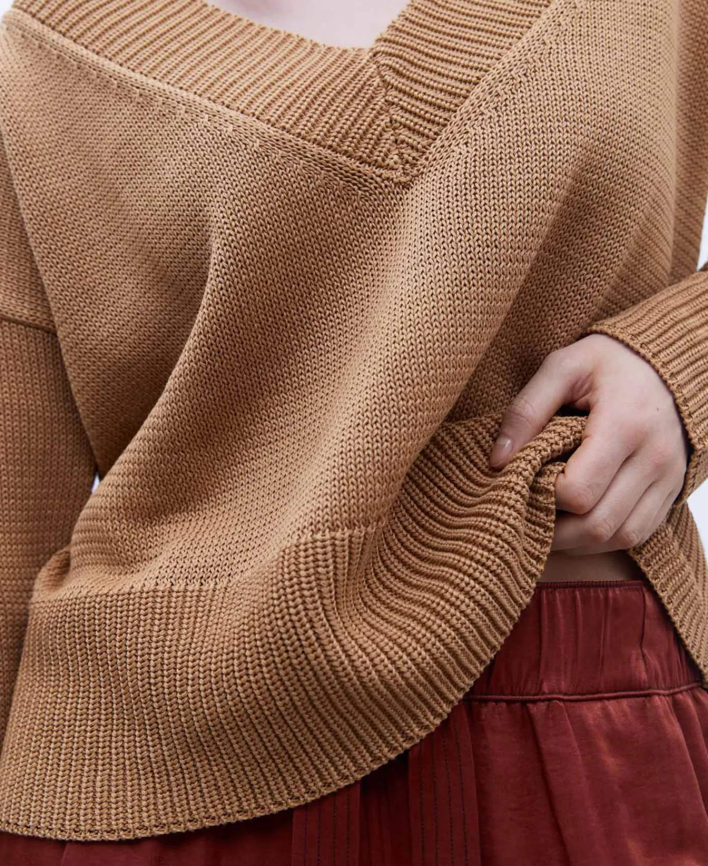 Camisola Com Decote Em V. Malha. Silhueta Ampla. Manga Comprida E Caida. Acabamentos Canelados.
