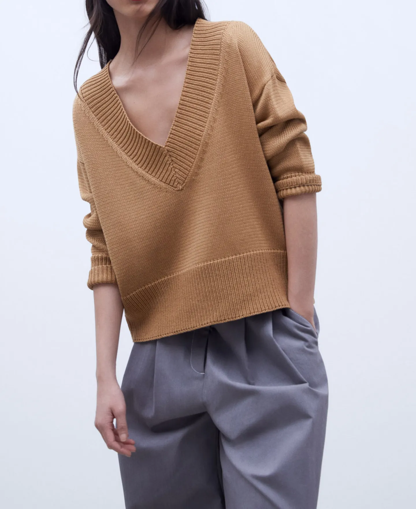 Camisola Com Decote Em V. Malha. Silhueta Ampla. Manga Comprida E Caida. Acabamentos Canelados.