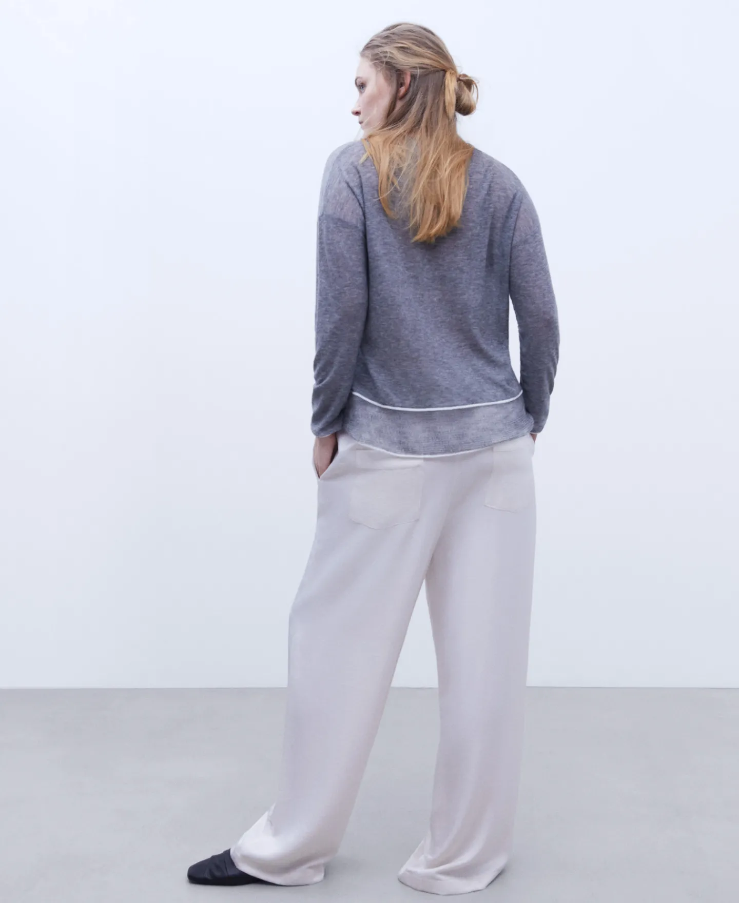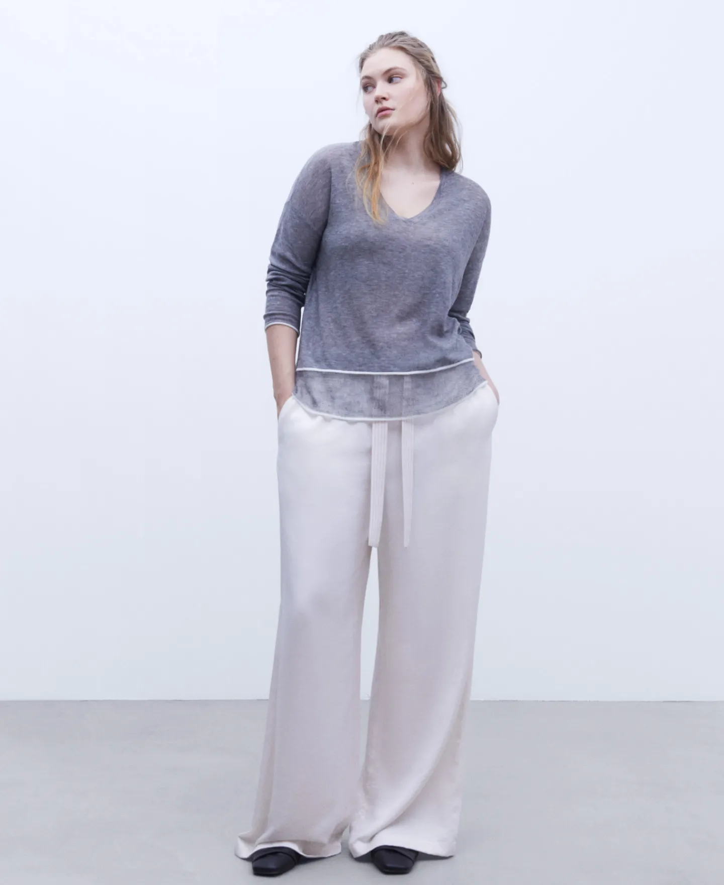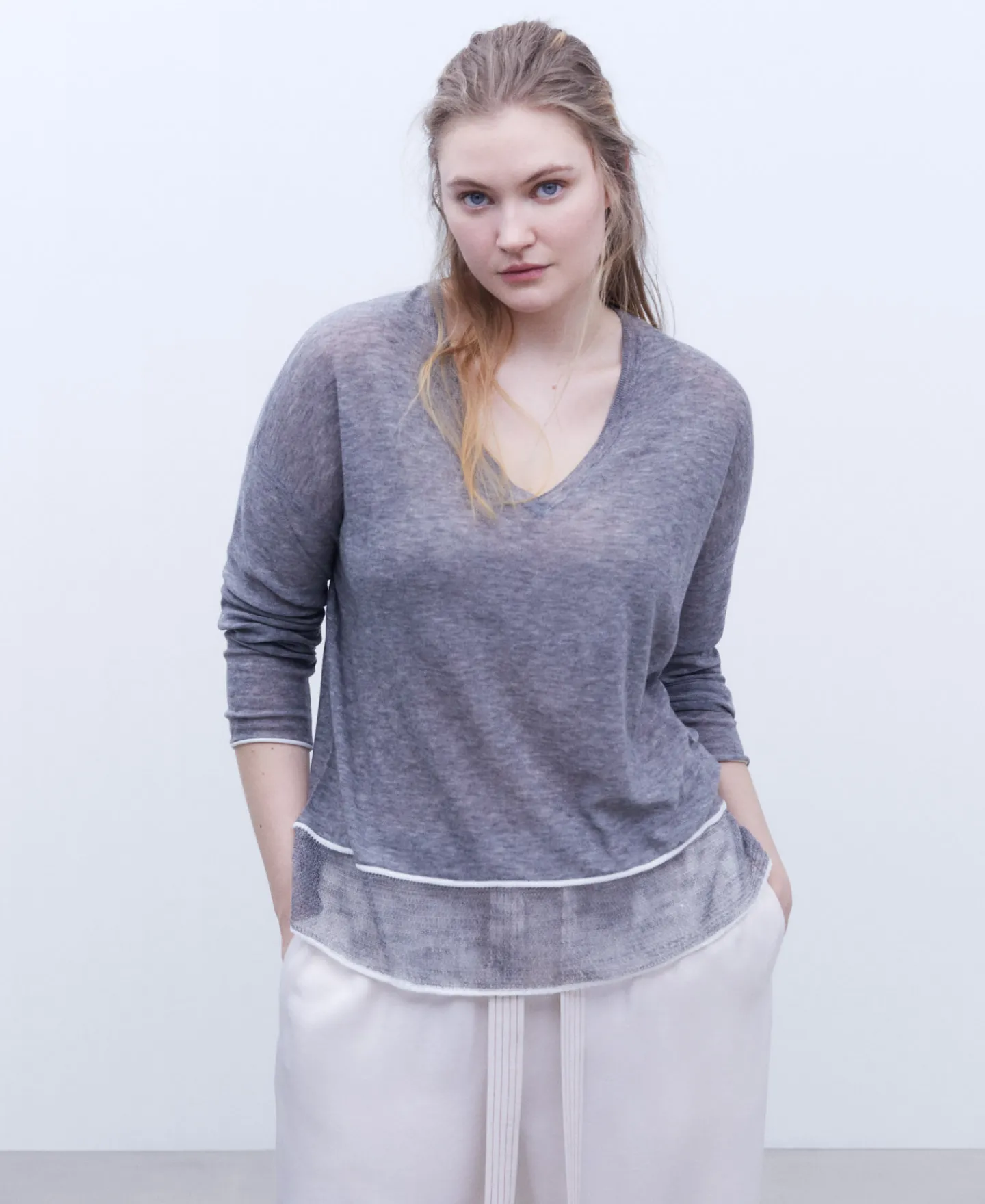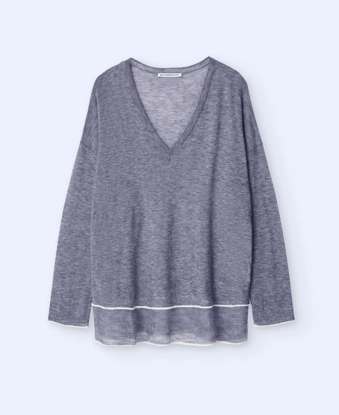 Camisola Em Tecido De La Merino. Gola Em V. Manga Comprida E Caida. Bainha Com Acabamentoem Contraste.