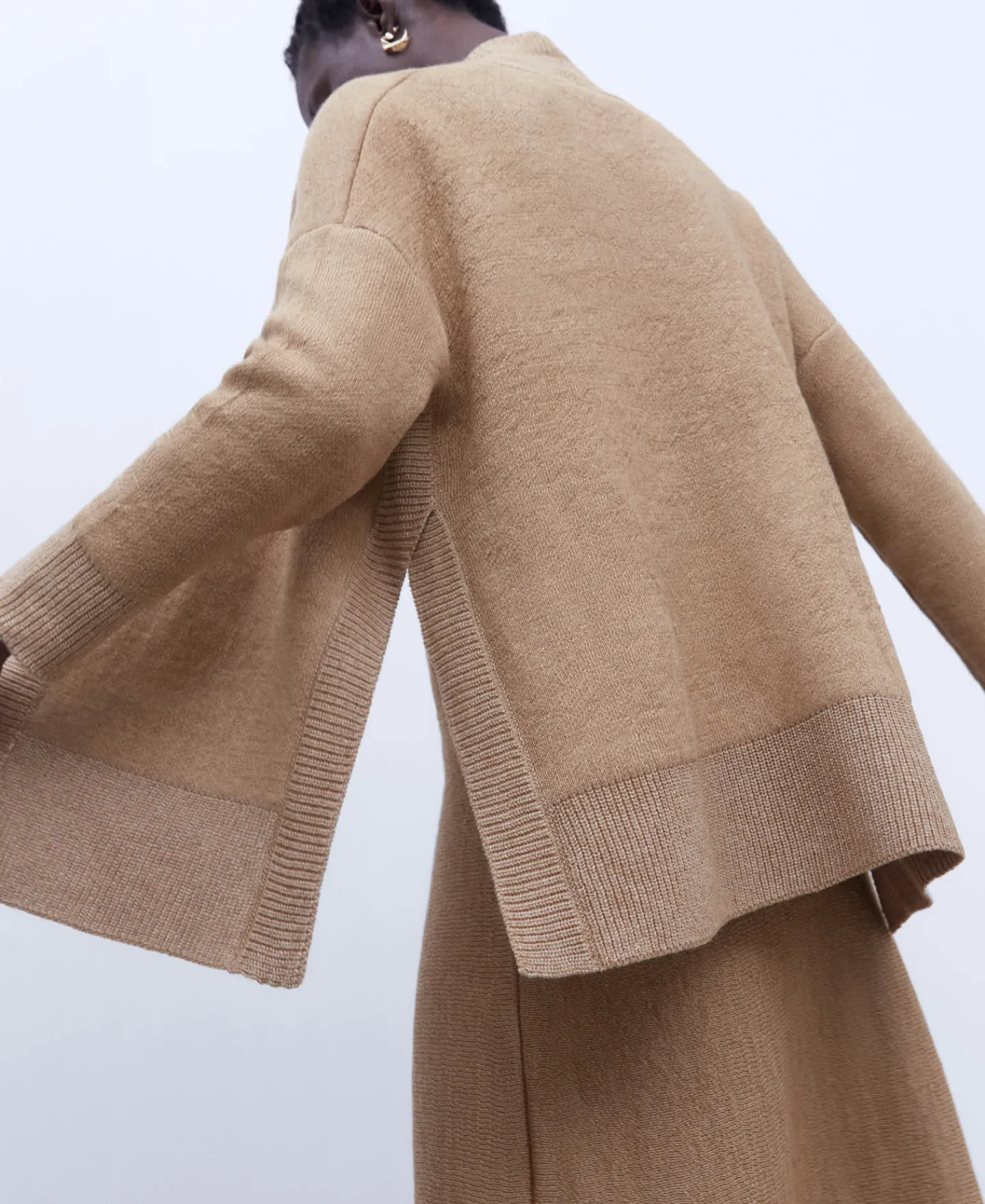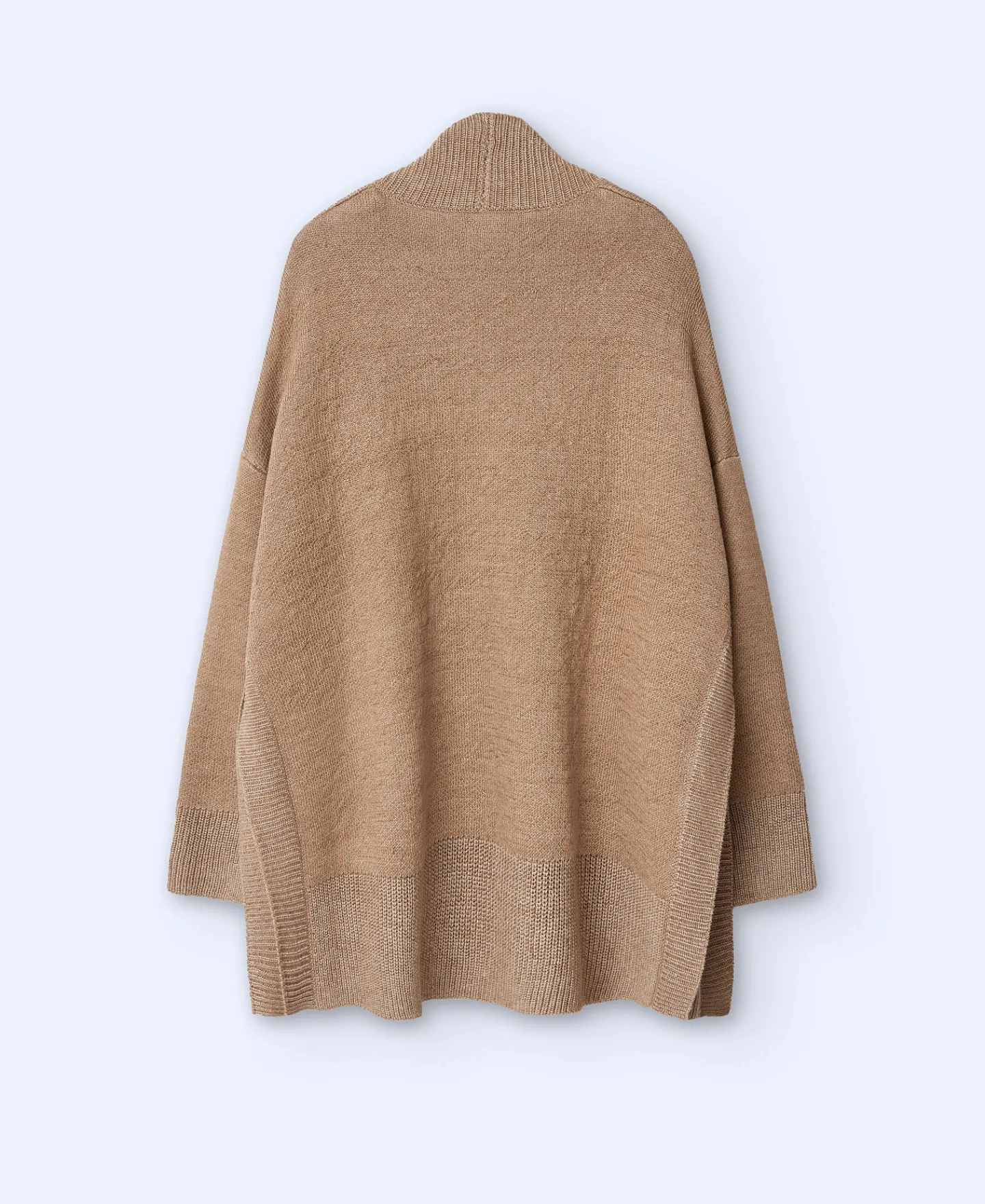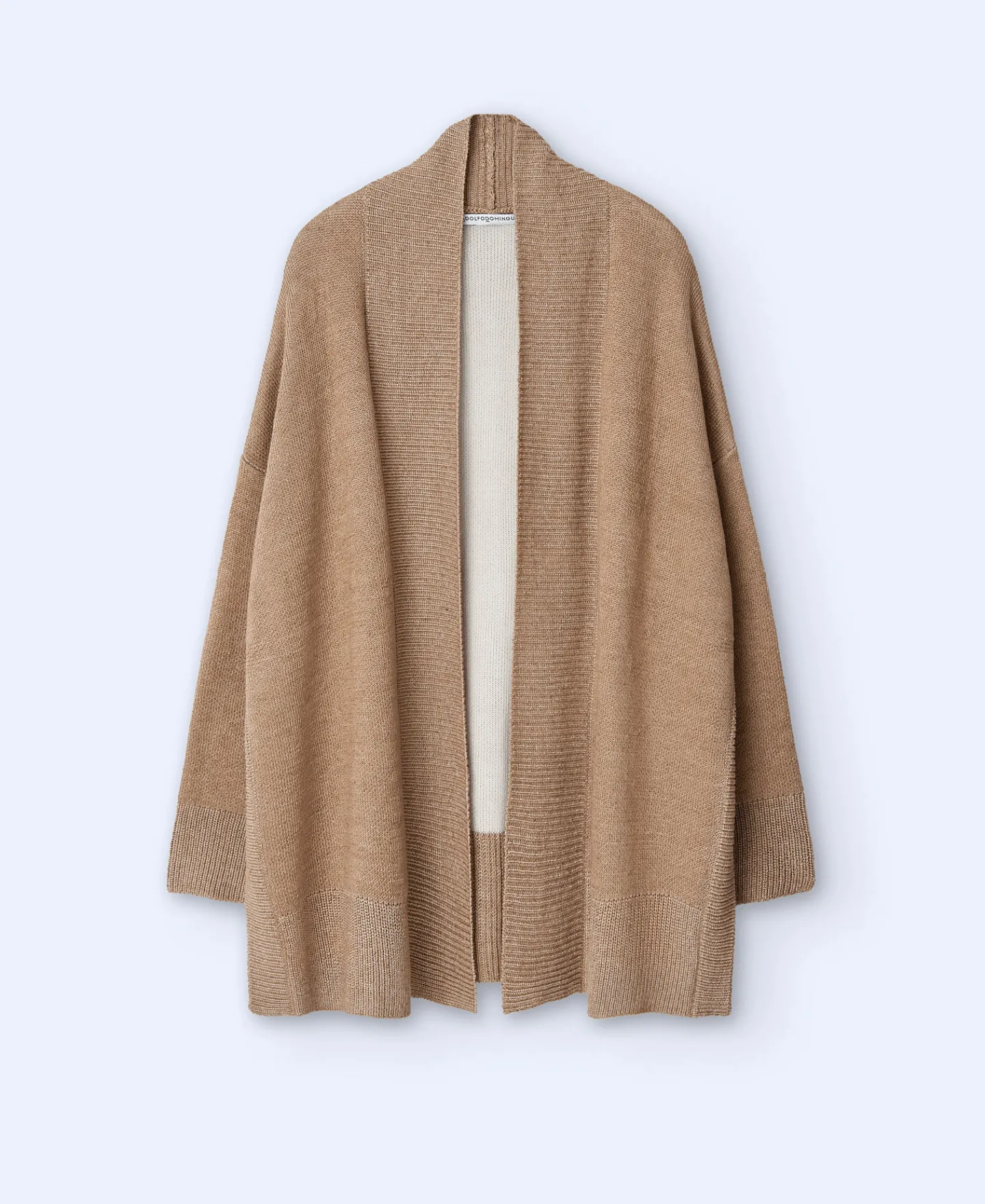 Casaco De Malha Em Dupla Frontura. Tecido De Linho. Gola Quimono. Manga Comprida. Abertura Lateral. Acabamentos Canelados.