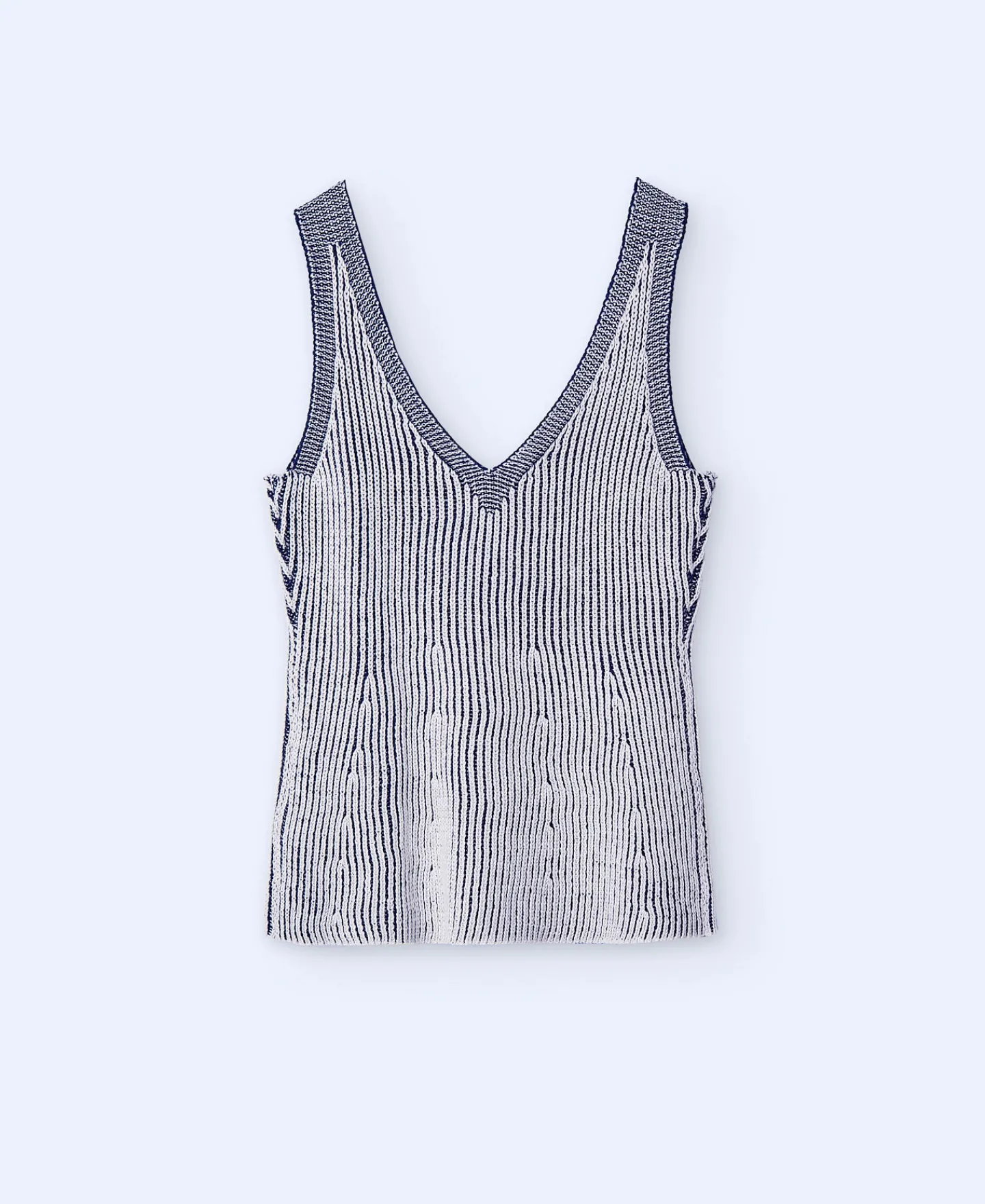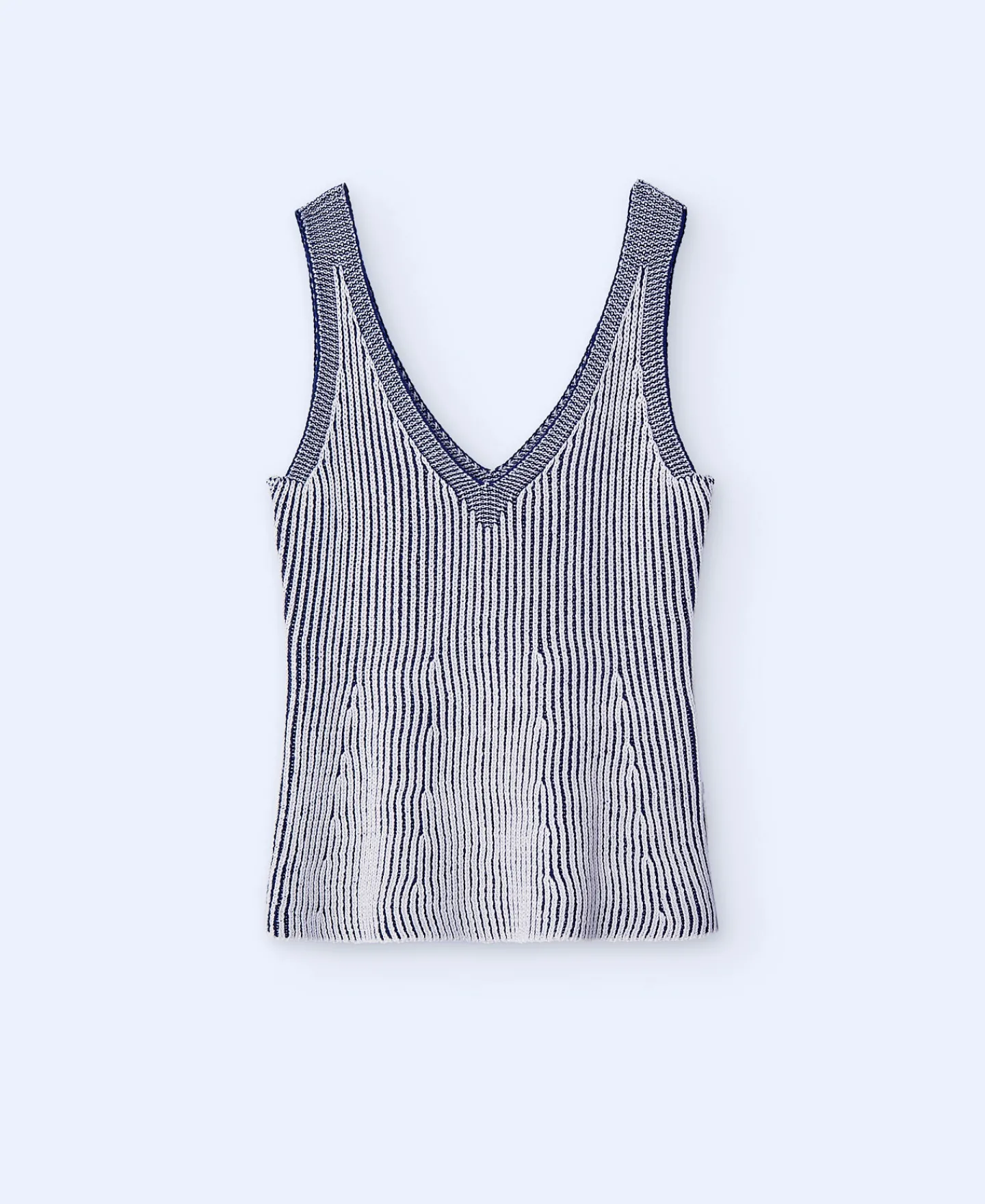 Top Com Decote Em V Duplo. Malha Vanise. Manga Cava. Peplum. Bainha Reta.