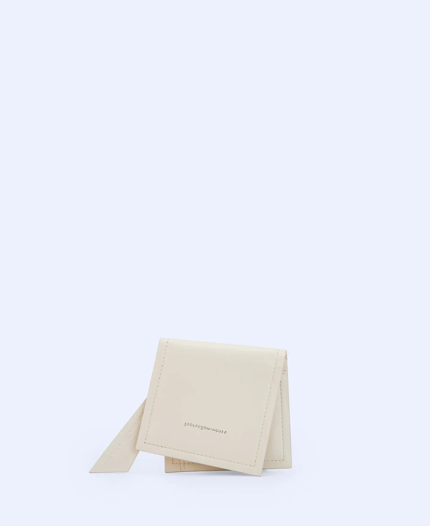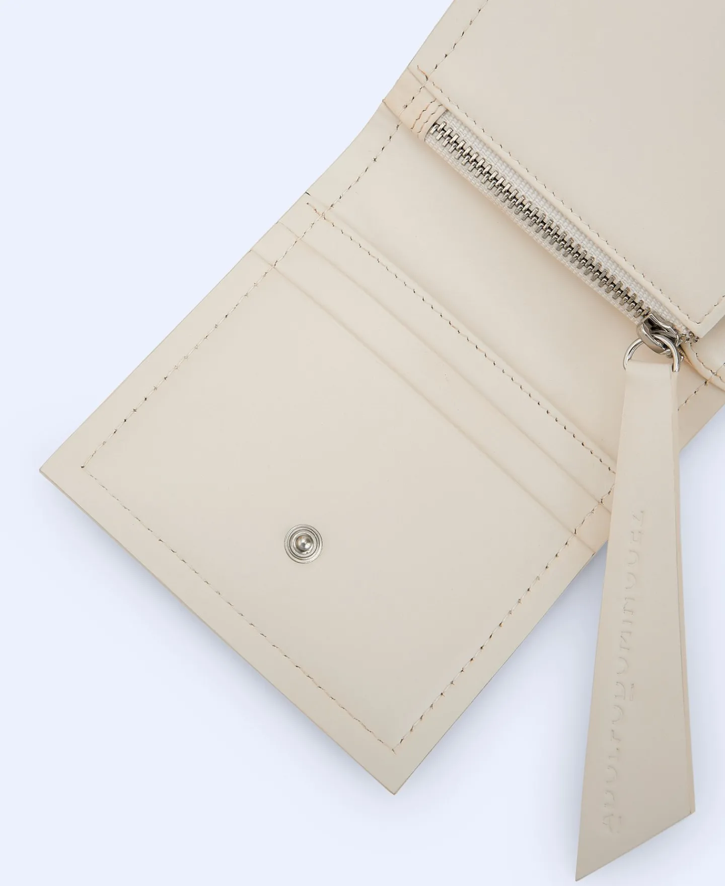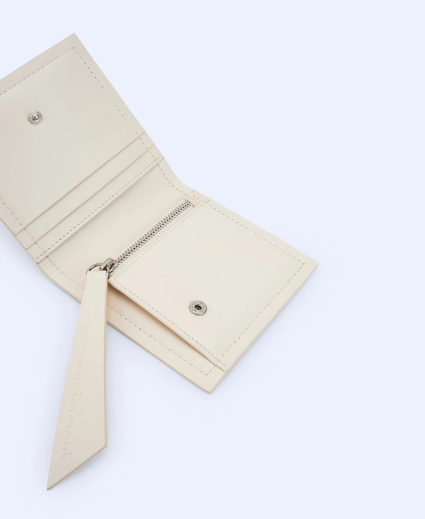 Carteira Assimetrica Em Pele De Vaca. Fecho De Aba Com Botao De Encaixe. Multi-Compartimento. Fecho De Correr. Puxador Com Logotipo.