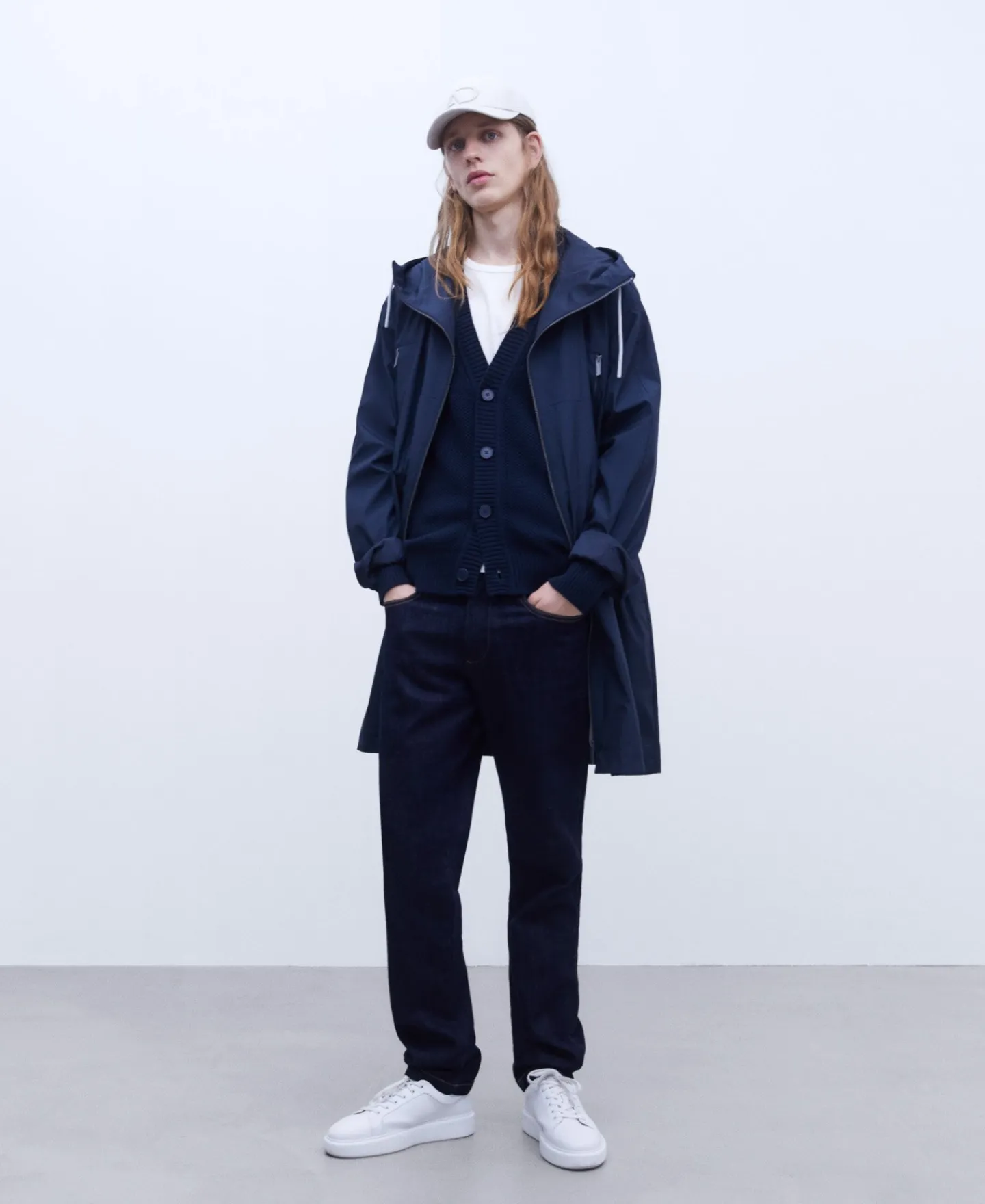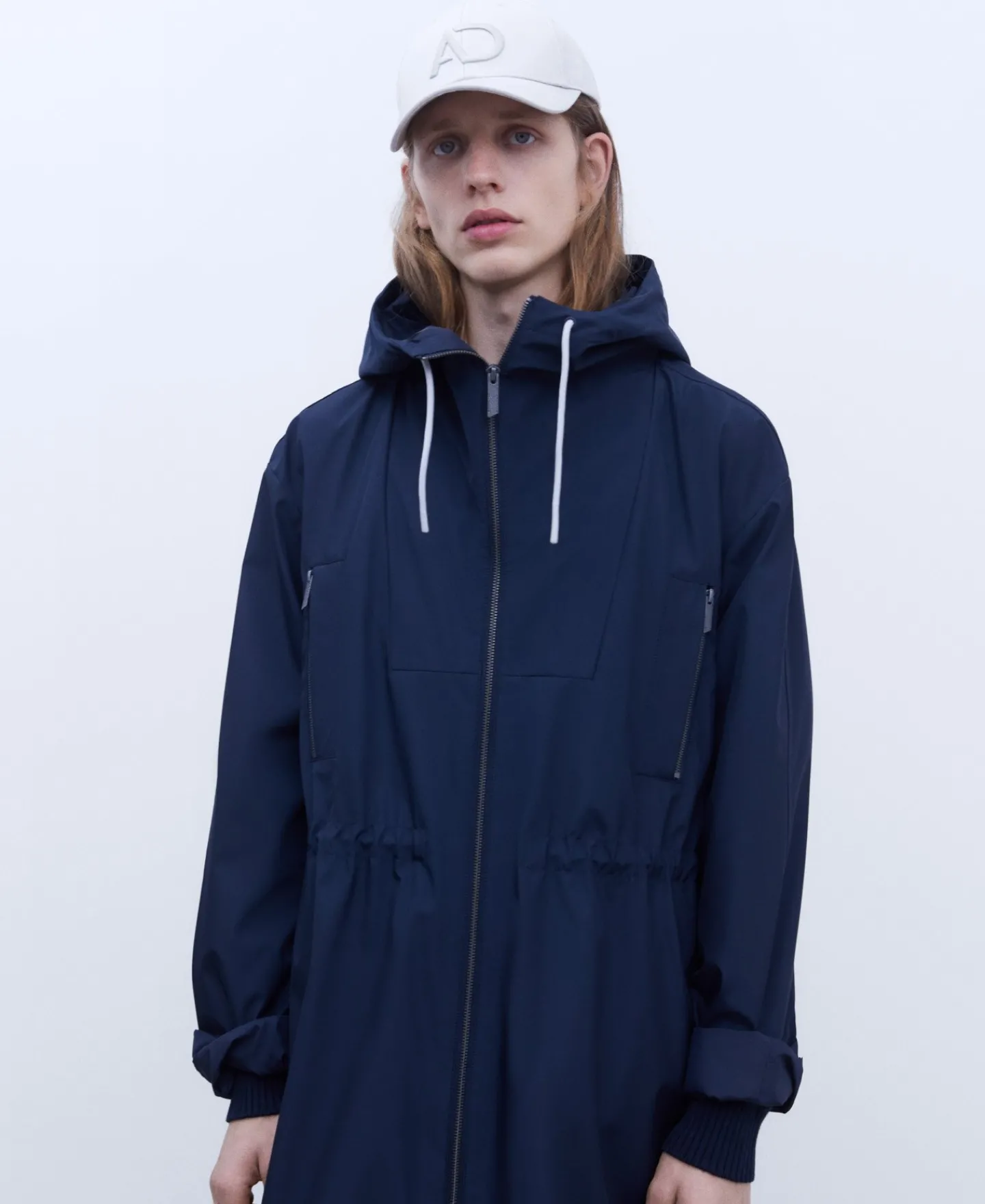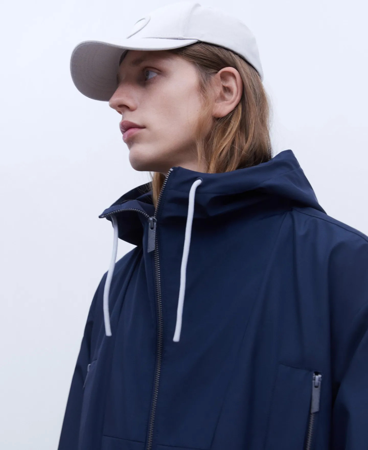 Parca Nautica Com Capuz. Fecho De Correr. Bolsos Laterais Obliquos. Ajuste Elastico Na Cintura. Bainha Reta.
