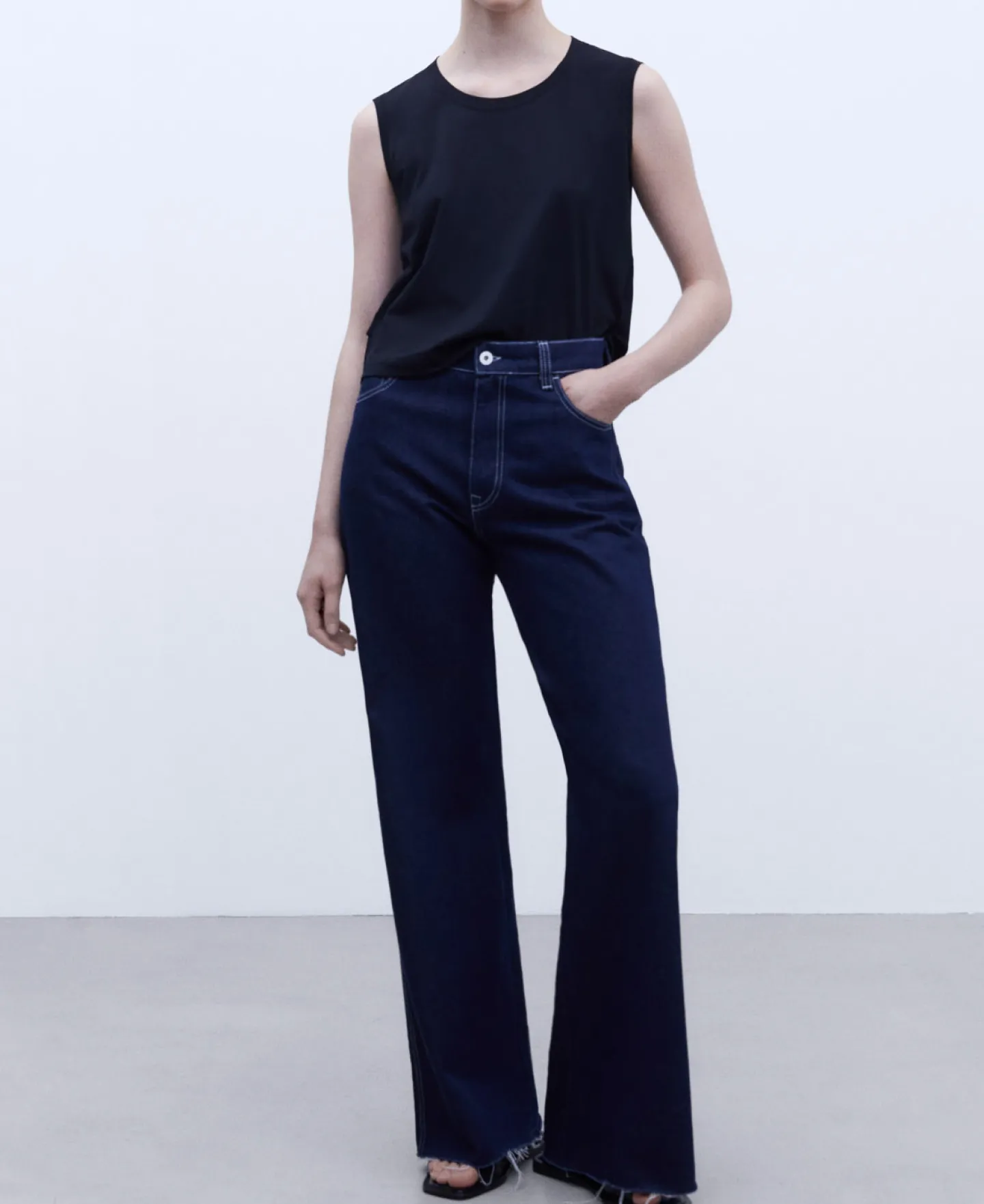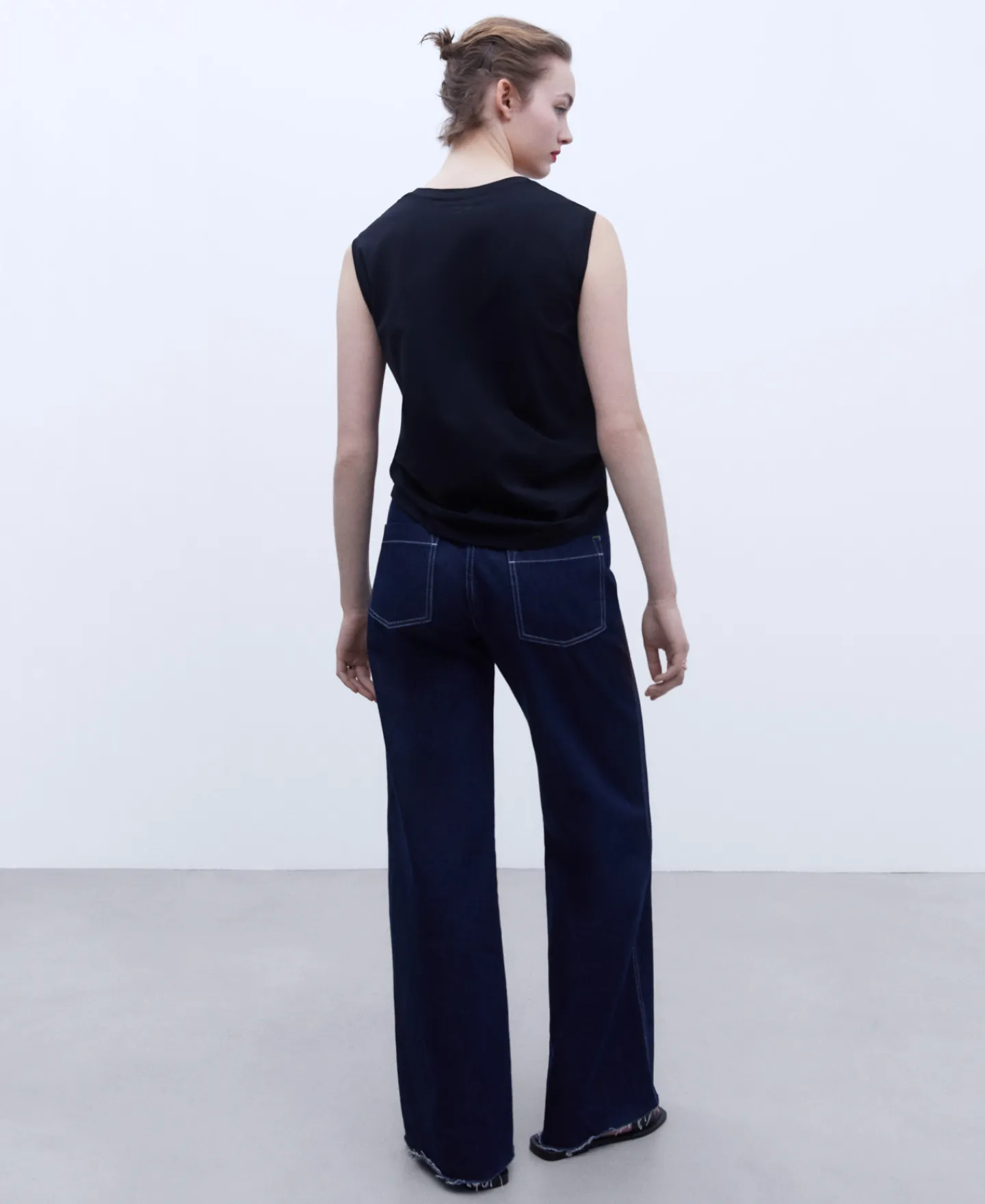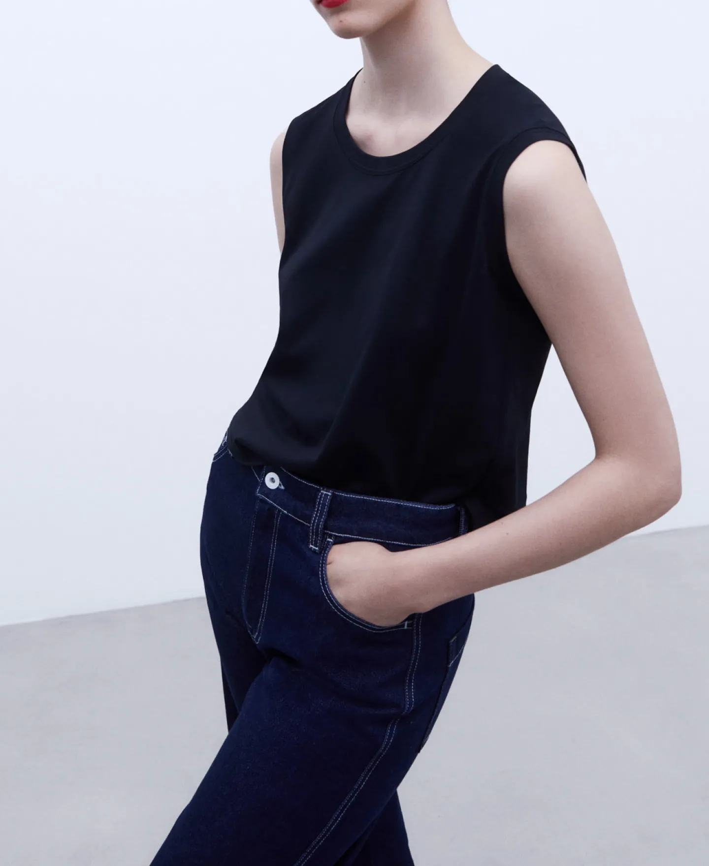 Cava Baixa. Gola Caixa Com Overlock. Pincas Laterais. Efeito Arredondado. Pela Cintura.