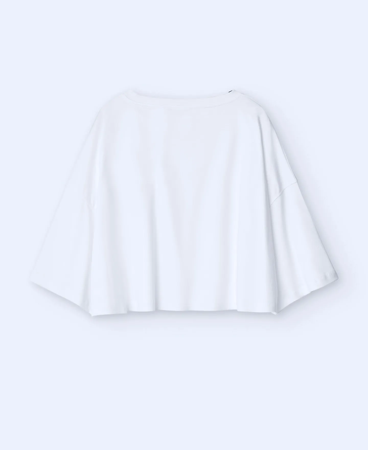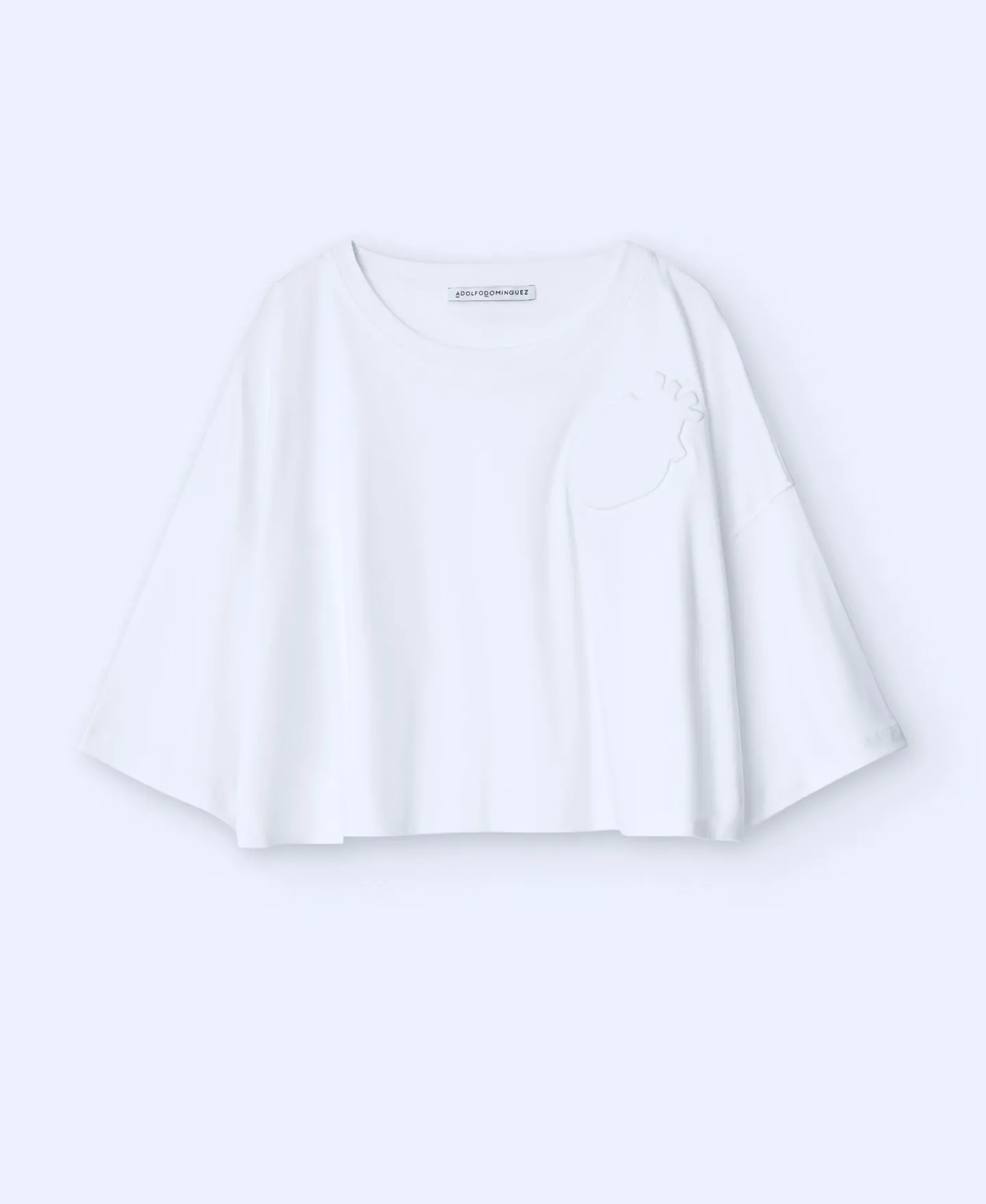 Camisola Com Coracao Em Relevo. Gola Caixa. Manga Curta. Corte Amplo. Bainha Reta.