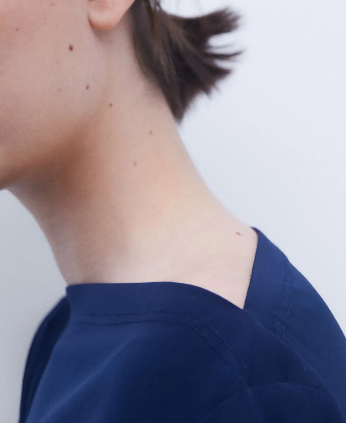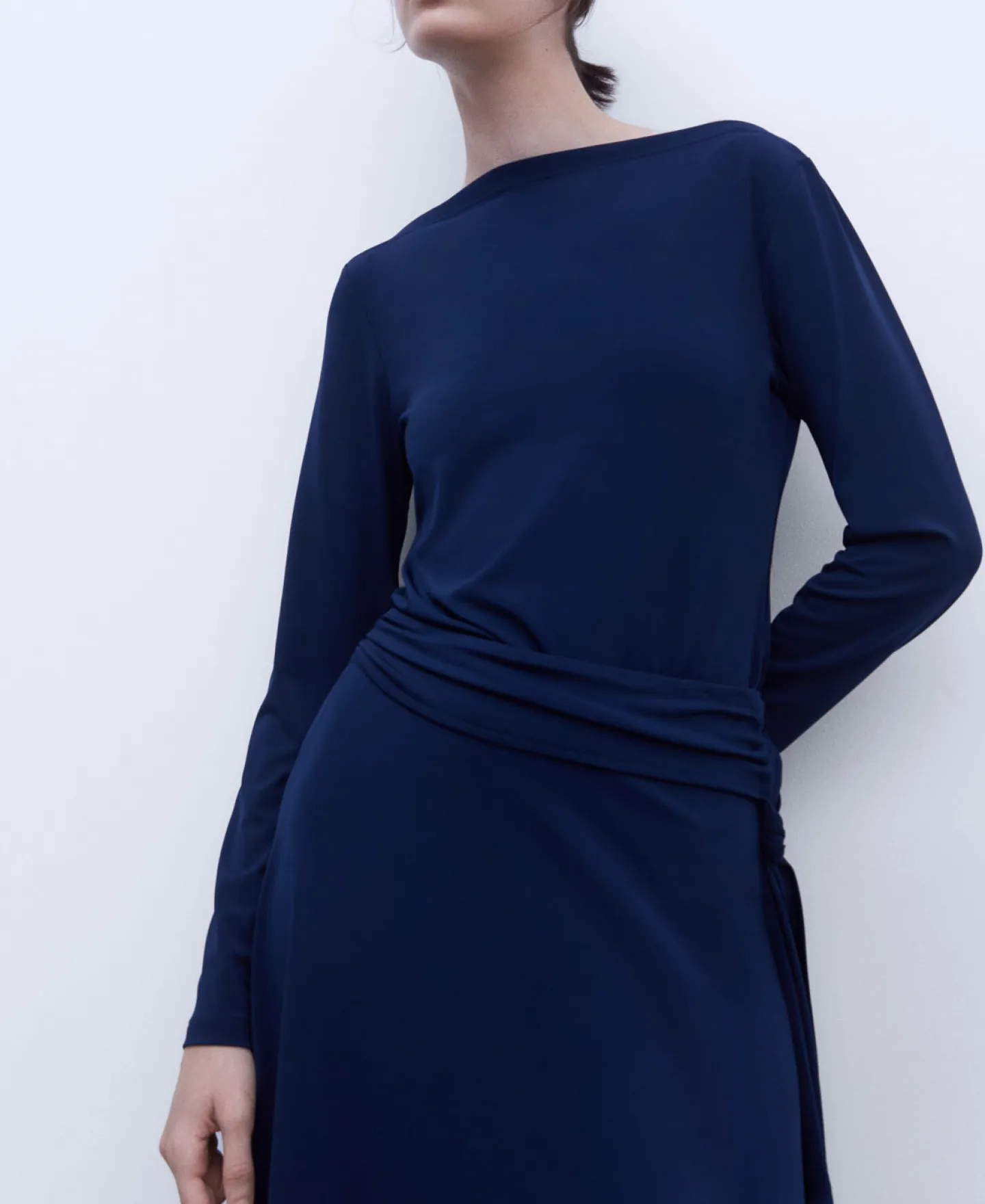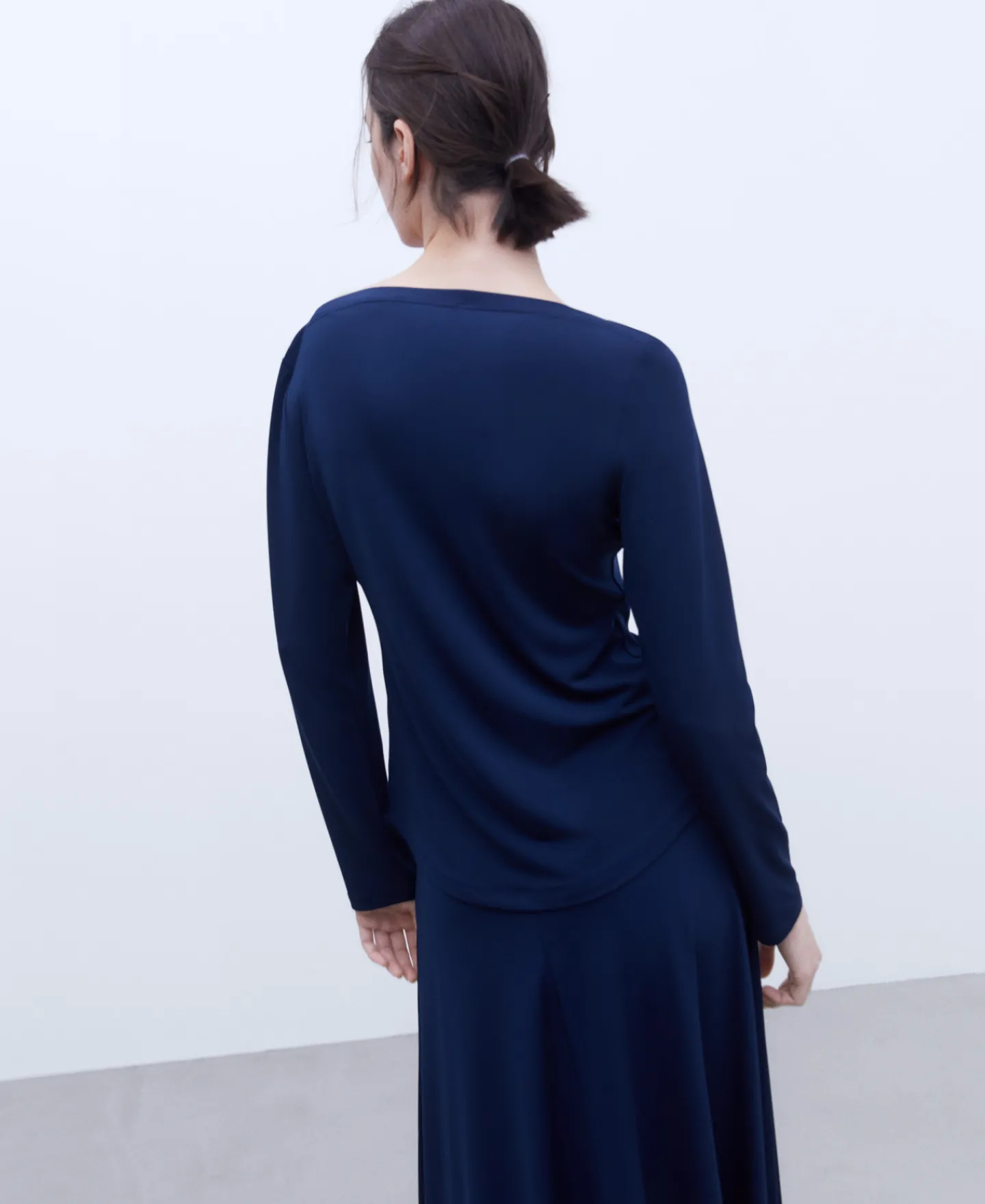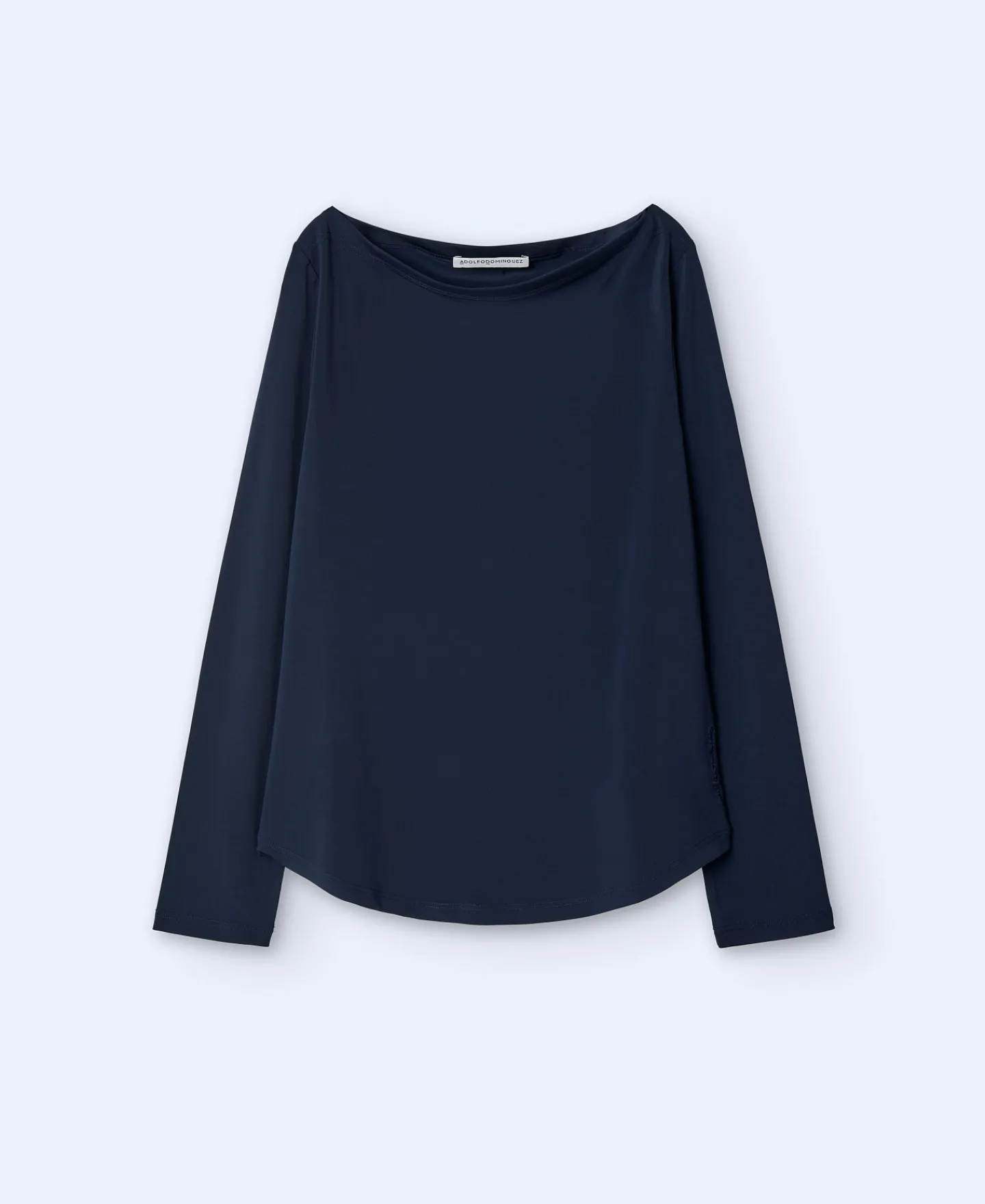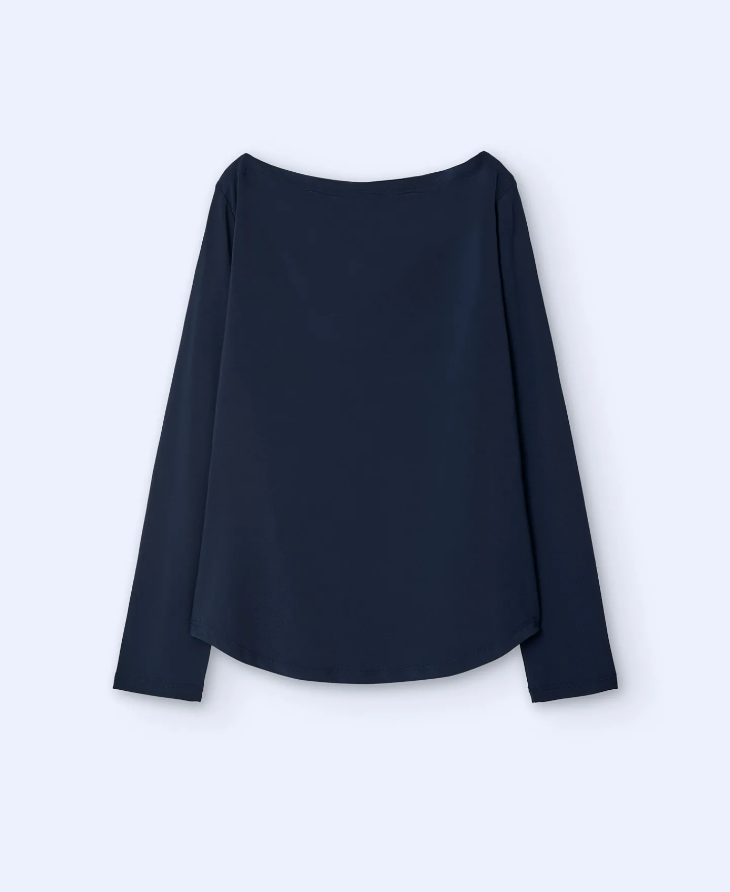Camisola Com Decote Barco. Manga Comprida E Sobreposta. Semicintada. Bainha Arredondada. Logotipo.