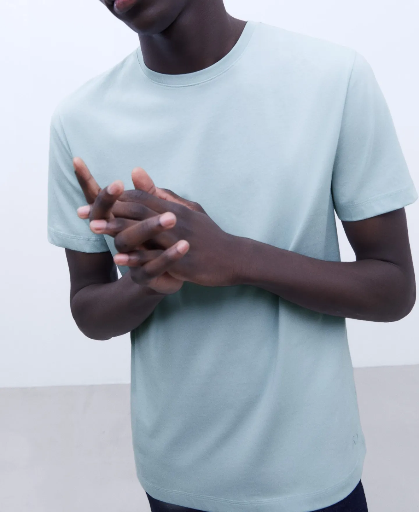 Manga Curta. Gola Redonda. Tripla Costura. Remates Canelados.